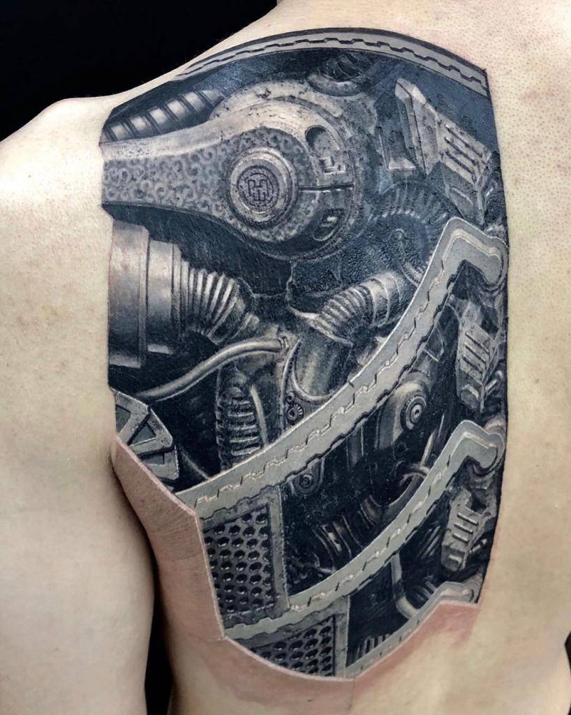 Благодаря большой площади кожного покрова спина является идеальным местом для нанесения тату. Здесь мастер может реализовать свои самые смелые задумки. Прорисовка большого количества механических элементов позволяет придать узору максимальную эффектность.