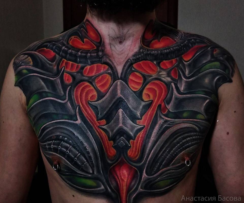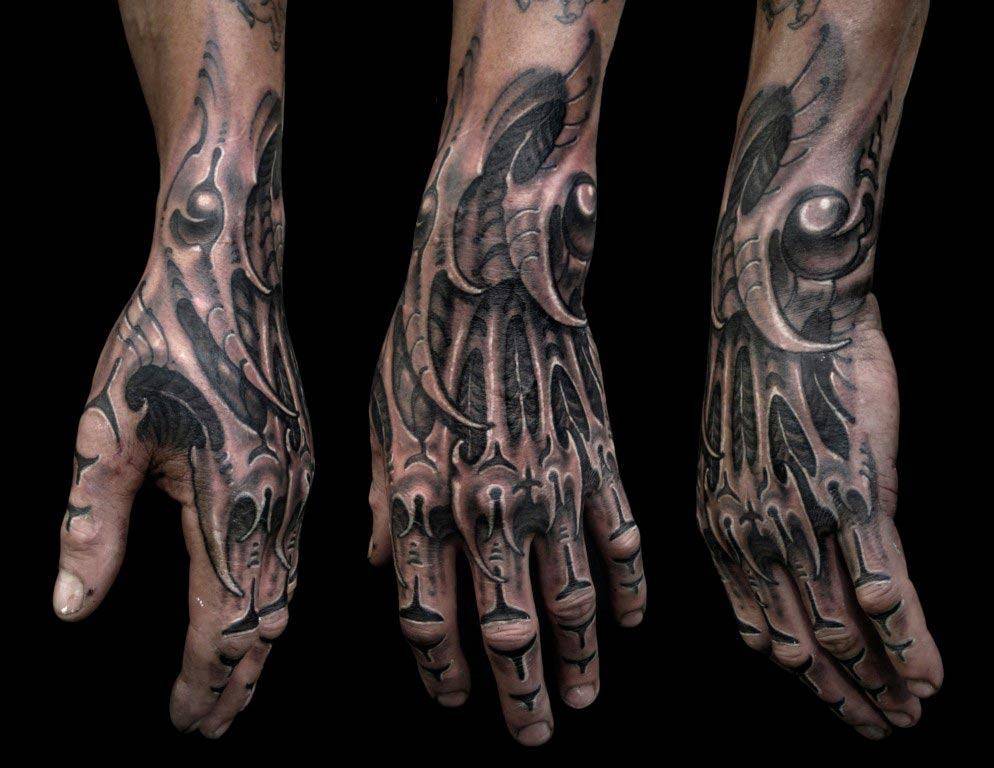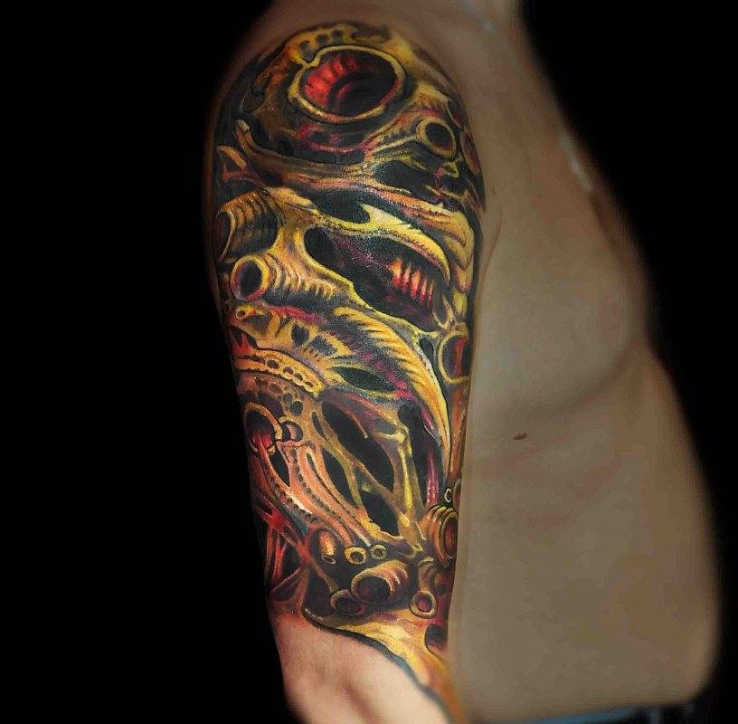 Эскизы тату биомеханика, довольно часто являются детальной копией работ европейского художника Г. Р. Гигера, который выступал представителем фантастического реализма. Многим покажется, что его творчество не знакомо, но это не так. Знаменитый мастер был приглашен в роли дизайнера на съемки знаменитой эпопеи «Чужой» и именно ему принадлежит внешний вид всех пришельцев. Татуировки биомеханика, выполненные на руке — это наиболее частое явление, конкуренцию данной локации может составить только, пожалуй, голень. Самый популярный набросок выглядит следующим образом: разорванная человеческая кожа позволяет просмотреть механические элементы конструкции. При этом технические составляющие должны быть переданы максимально реалистично. Даже небольшие детали, пружинки и провода, как будто являются частью сложного механизма, скрытого под человеческой оболочкой. Выбирая локацию, следует понимать, что изображение должно «выигрышно» смотреться. Если обладатель будущего рисунка имеет подтянутое и рельефное тело, то комбинация анатомического рельефа и тату станет идеальной.