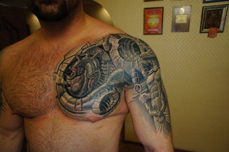 Также тату кибермеханика может размещаться на плече. Наиболее удачно рисунок будет выглядеть в том случае, если плечо накачано. Рельеф мышц придаст тату еще более объемный вид.