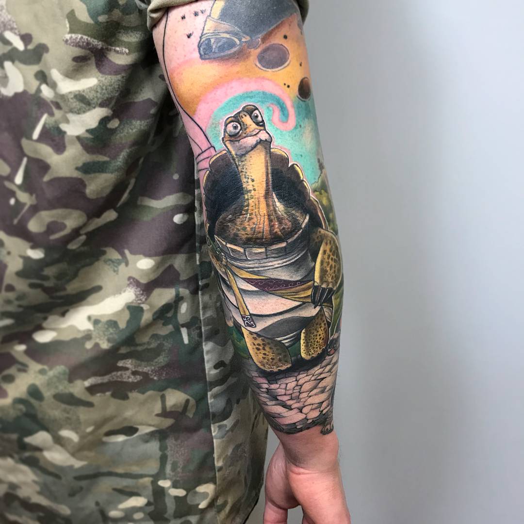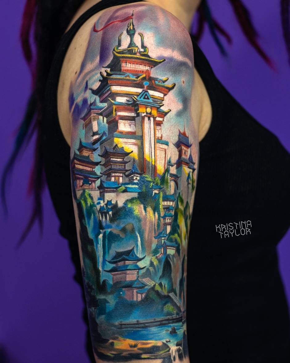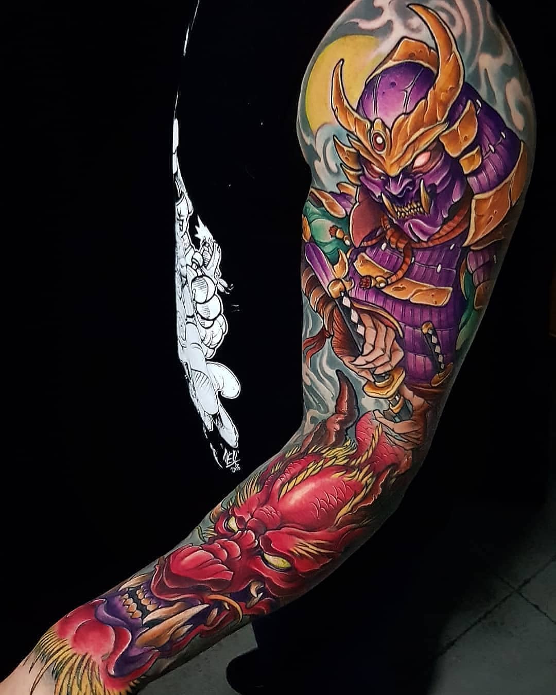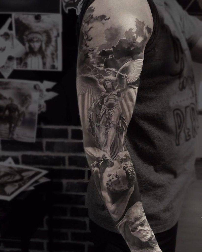Особенно удачно на плече смотрятся картины средних размеров. Впрочем, их можно удачно объединить с татуировками предплечья.