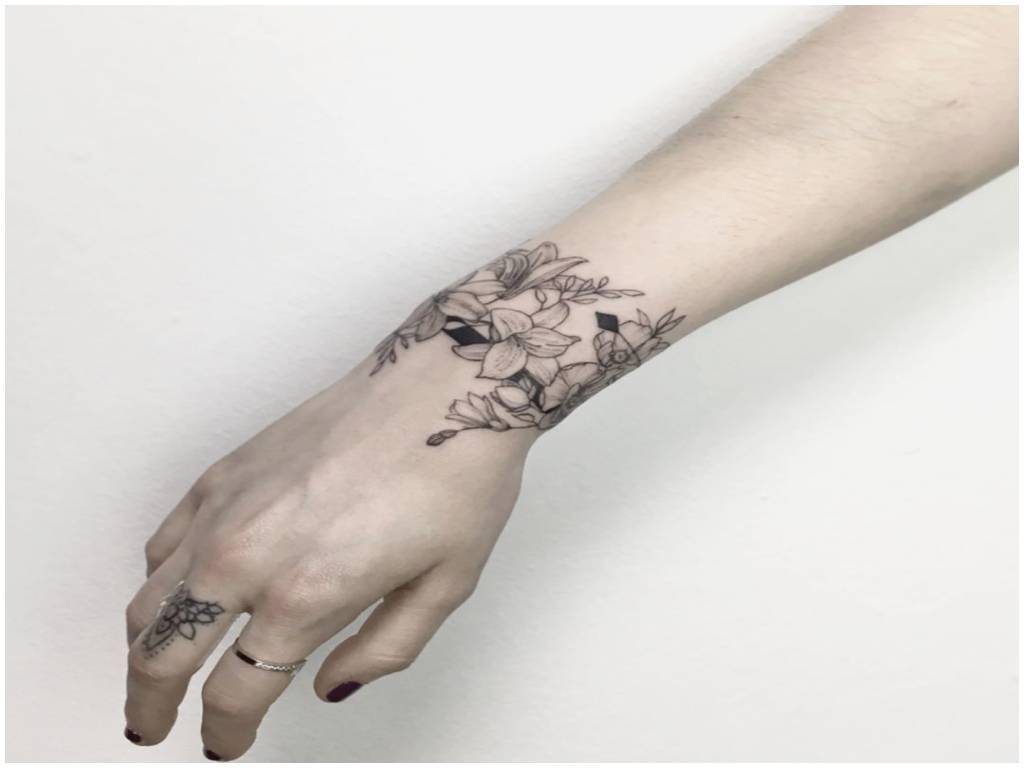 Не менее привлекательным и оригинальным решением для татуировки на руке можно назвать различные эскизы в виде браслета. В древности подобные нательные рисунки обеспечивали своему владельцу защиту высших сил. Сегодня отношение к тату браслетам немного изменилось, но в целом рисунки такого характера продолжают считаться оберегами, ведь, как известно, замкнутая в круг линия является могущественным защитным символом. Также следует отметить, что татуировка в виде браслета может выполнять роль ненавязчивого и симпатичного украшения и не иметь каких-то определённых трактовок. Для нанесения тату браслета используются всевозможные растительные узоры, в которые вплетены цветы, а также различные геометрические фигуры, элементы, имитирующие металлические детали, тонкие линии и орнаменты. При этом мужские татуировки отличаются чёткостью линий и некой брутальностью, а для женских эскизов характерны более утончённые вариации рисунков.