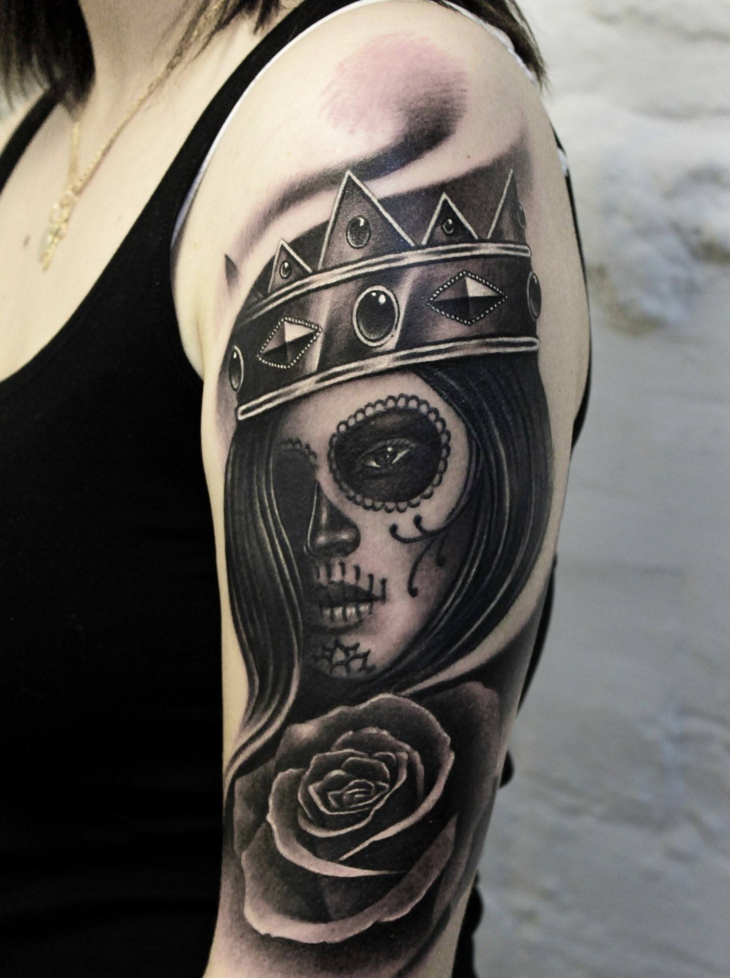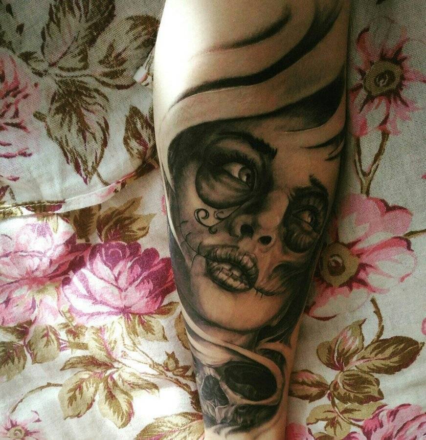 Чаще всего изображают красивых девушек, черепа либо девушек с элементами смерти. Это все для полной картины украшается цветами, узорами, шрифтами с различными объемными деталями.