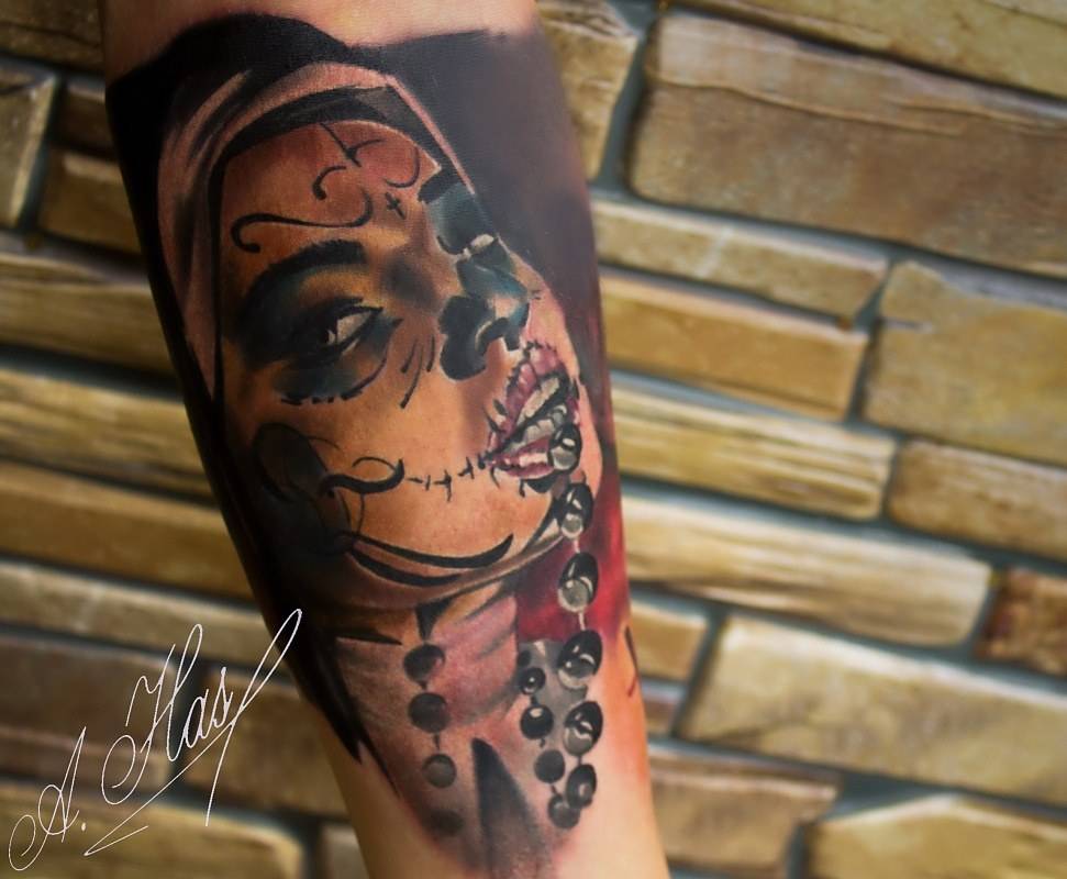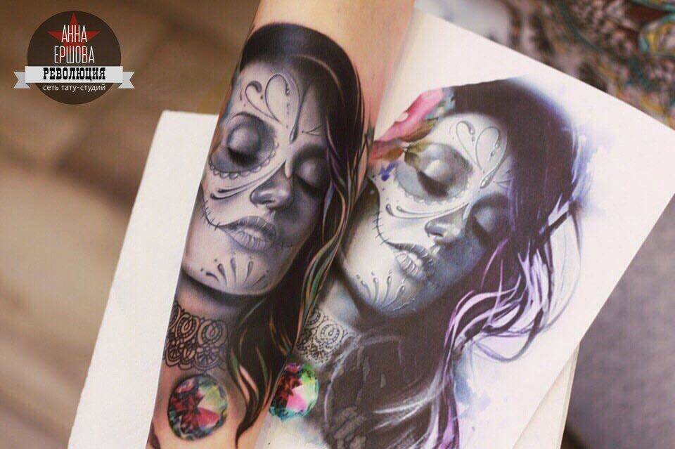 Изображение лица девушки чикано. Лицо девушки часто украшает маска-череп, отсылающая к мексиканским верованиям о хранительнице жизни и смерти – дерзкой женщине, владеющей магией, властью над мужчинами. Обычно, набивается на плечо. Креативно выглядит тату чикано на ноге.