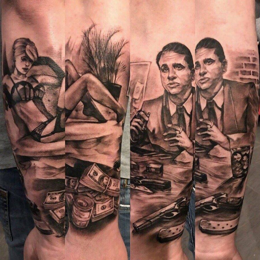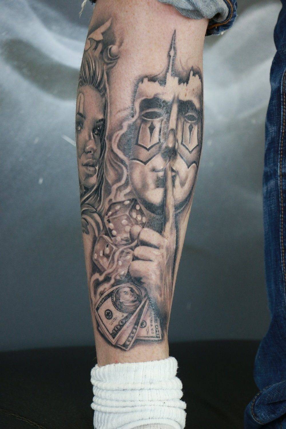 - Оружие. Это один из самых красноречивых символов криминальной романтики, неотъемлемый атрибут преступного мира. Сейчас, когда стиль чикано перестал быть прерогативой мексиканских банд, изображение пистолета указывает на сильную личность, способную постоять за себя, защитить свои интересы любой ценой. Хорошо смотрятся работы с пистолетами и деньгами, масками, черепами на предплечье или плече.