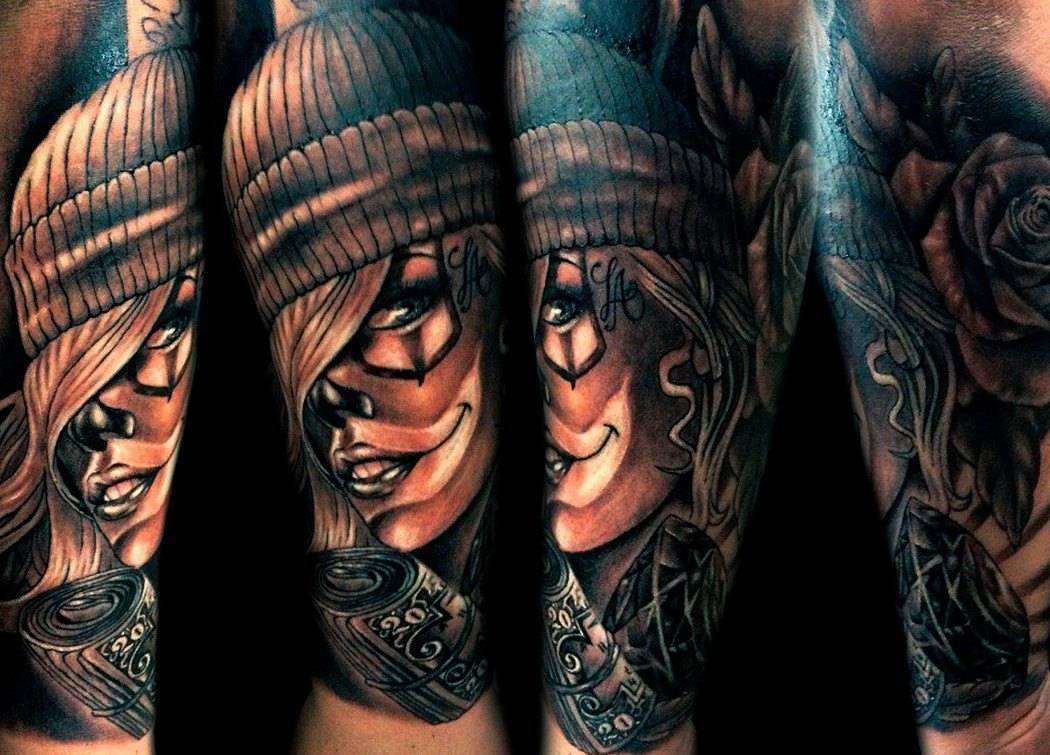 Самый распространенный эскиз на плече чикано – девушка, что может держать пистолет, деньги, игральные карты, череп и многое другое, типичное такой тематике. Рисунок отлично подчеркивает рельеф и силу мужского плеча.