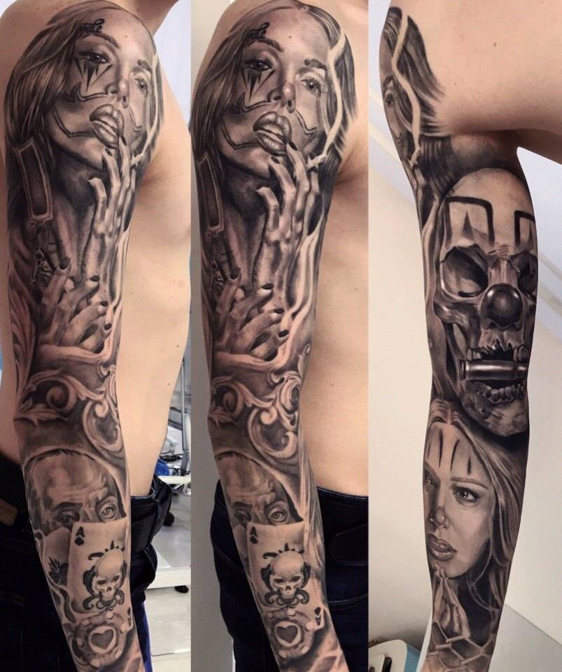 Рукав – это сплошная наколка на руке, полностью ее перекрывающая. Речь идет о целой художественной композиции, где собраны разные персонажи и предметы. Это могут быть девушки, разные лики святых и иконы, другие сюжеты.