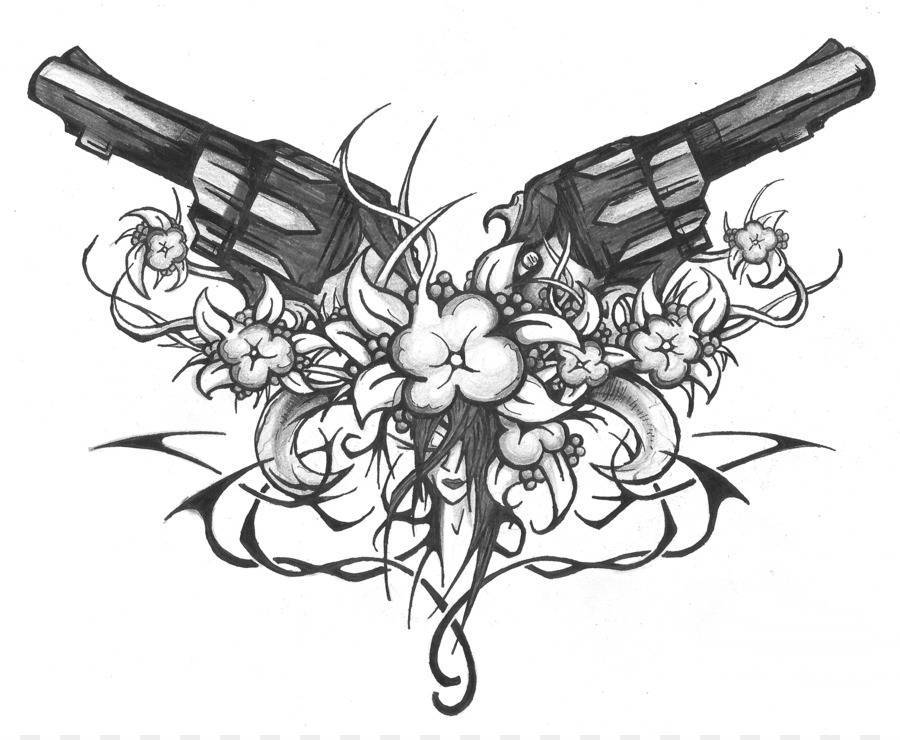Рисунок для тату в виде пистолета и цветов — женственная вариация дерзости