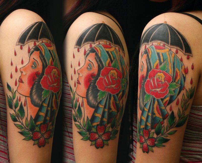 - Old School – классическое американское видение татуировки (пин-ап, розы, сердца, орлы);