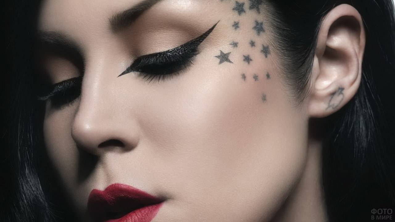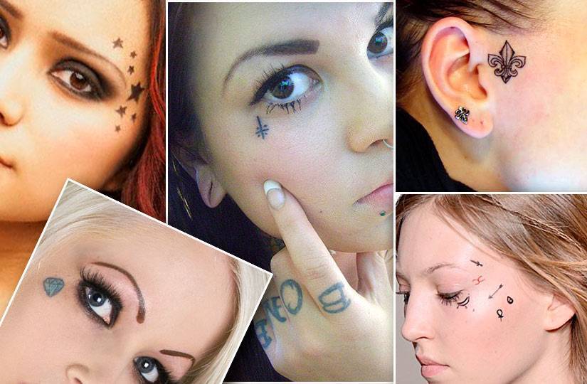 С женщинами, решившими сделать татуировку на лице, все гораздо сложнее, так как тех, кто хочет набить себе что-то уродливое в разы меньше, чем мужчин. Чаще всего девушки украшают лица микро-тату. Это могут быть: звездочки, точки, тату-надписи, геометрические фигуры, стрелки. А еще многие девушки часто наносят на лицо тату точки. Это может быть, как точечный дизайн, так и имитация родинок или веснушек.