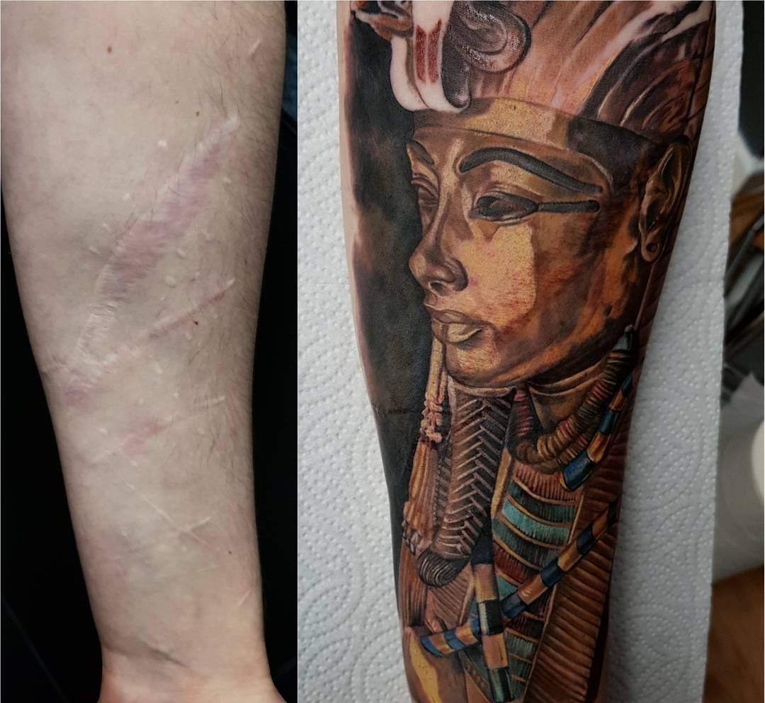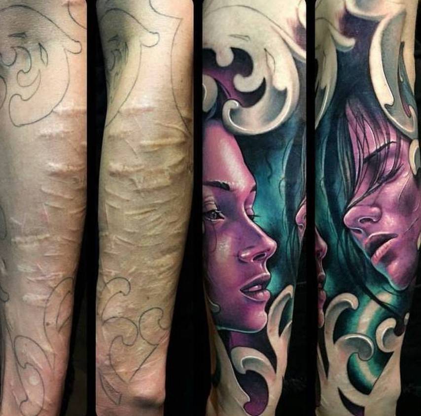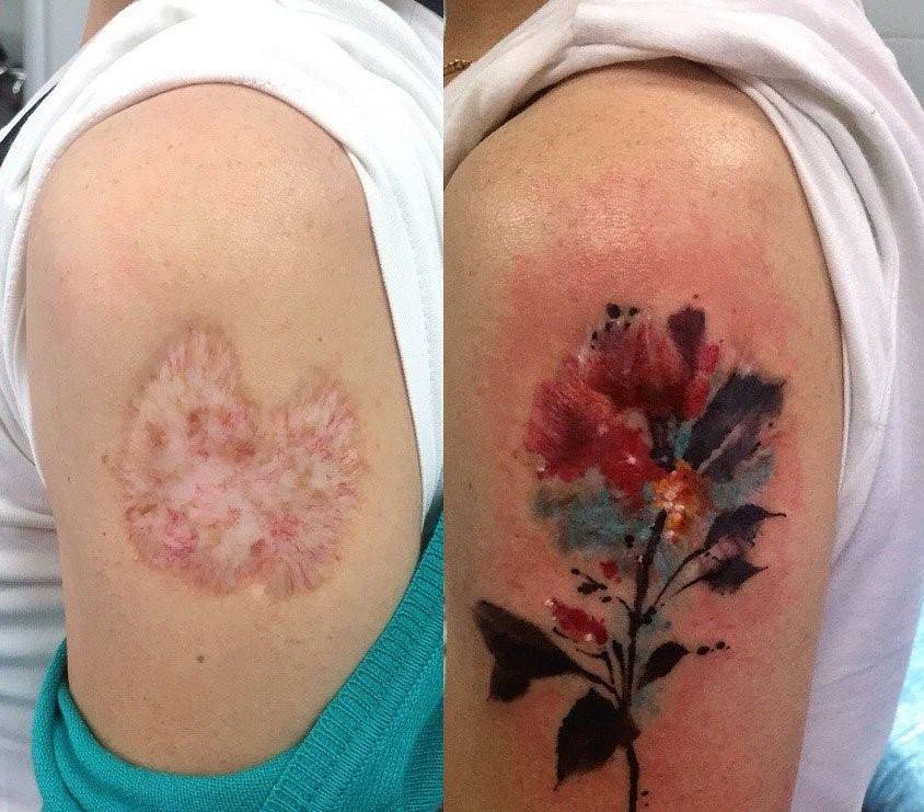 Как правило, для перекрытия шрамов выбирают цветные татуировки, особенно если текстура рубца неравномерная и отличается по цвету. Чем более сложный и серьезный шрам на вашем теле, тем более приемлемой будет яркая цветная татуировка.