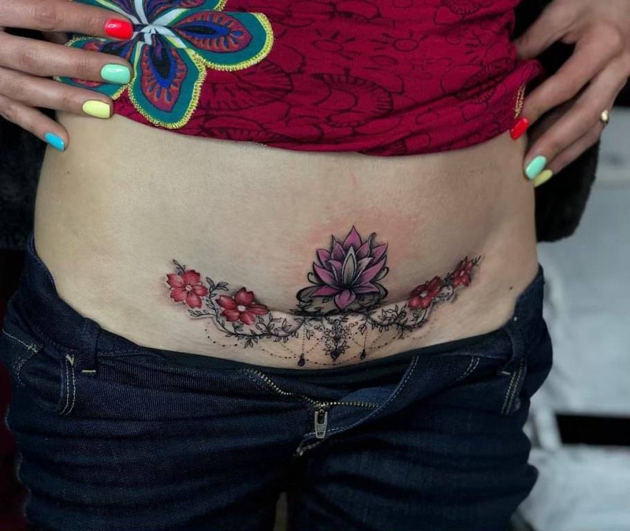 Любая женщина, которая готовится стать мамой, может столкнуться с таким оперативным вмешательством, как родоразрешение путём кесарева сечения. После данной процедуры остаётся шрам в нижней части живота, который в большинстве случаев создаёт дискомфорт и вызывает стеснение. Для тех, кто решается исправить этот дефект путём нанесения татуировки, мастера предлагают большой выбор эскизов, которые помогут «замаскировать» эту проблему. В основном женщины предпочитают изысканные цветочные узоры с переплетениями, либо другие тематические рисунки или ажурные надписи. Стоит только отметить, что татуировки на таких шрамах выглядят красиво лишь на подтянутых мышцах, поэтому следует хорошо взвесить все плюсы и минусы перед выполнением этой процедуры.