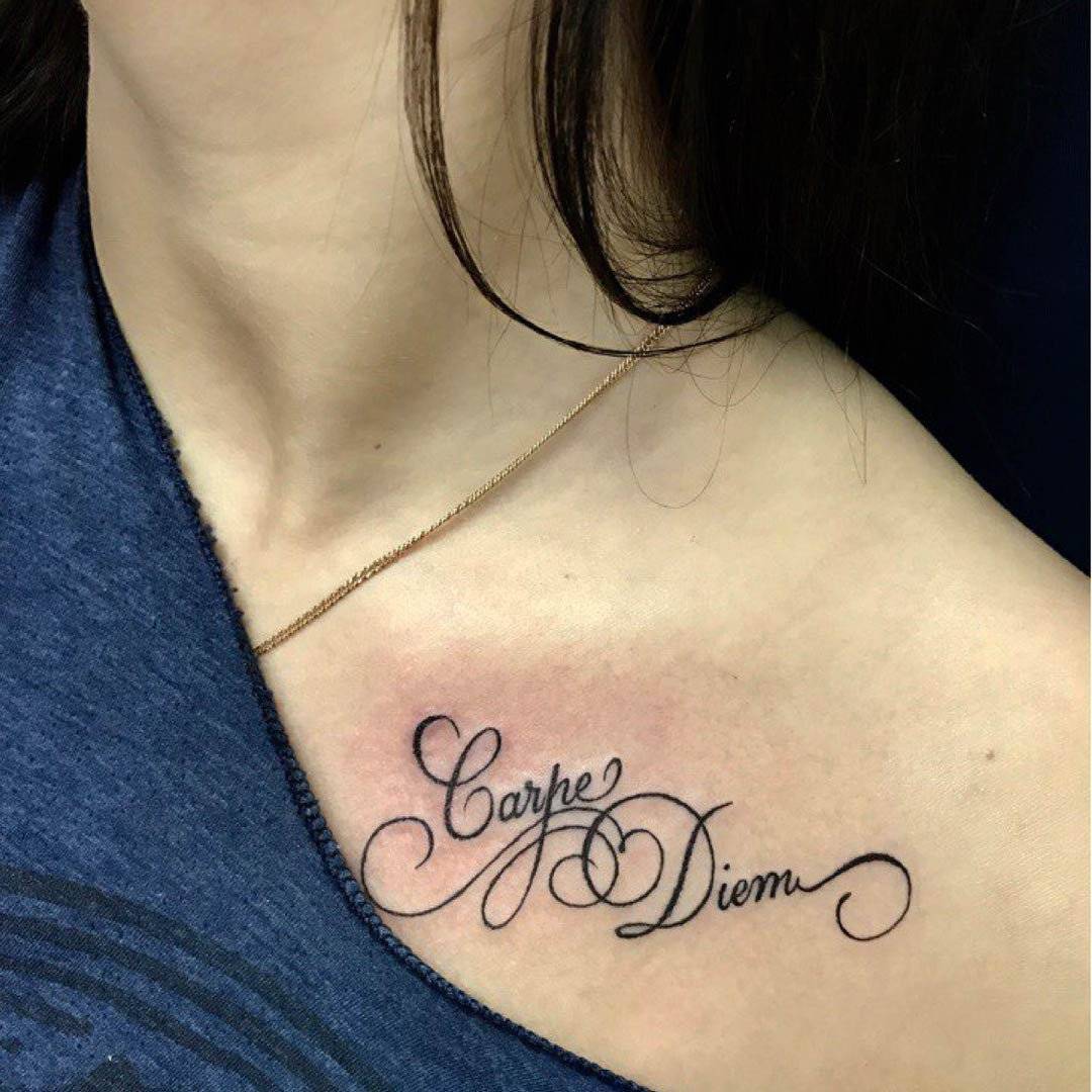Конкретное место для набивки тату надписи на латыни зависит от формы и размера текста, а также от смысла самой фразы. Согласитесь, серьезный постулат не может восприниматься, если набит на неуместной части тела. Если строчка длинная, то ее можно красиво разместить вдоль ключиц, на руке по длине предплечья.