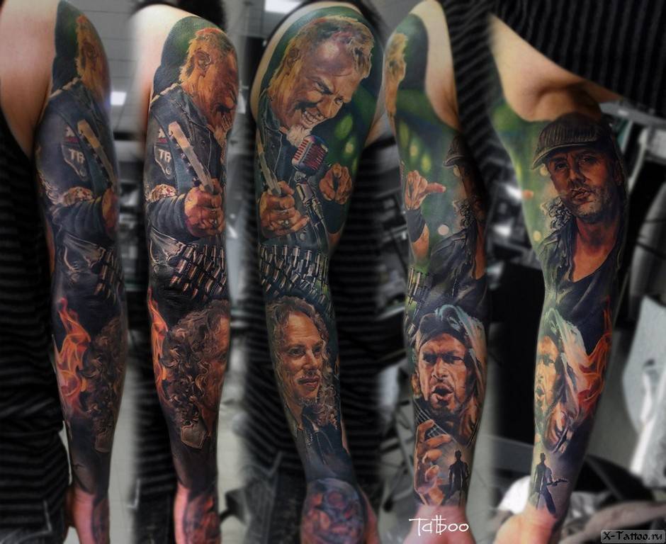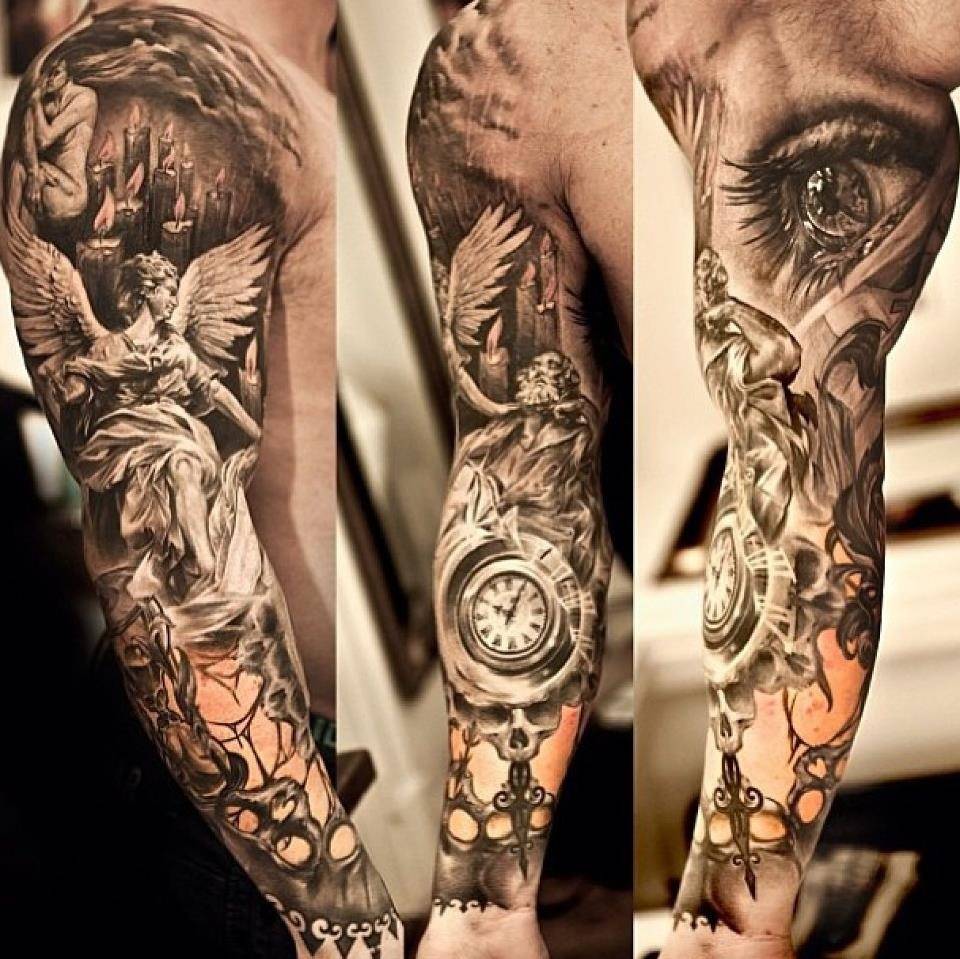 Самый популярный тренд последних лет – рукав в стиле реализм. Такая наколка полностью перекрывает окружность руки, представляя собой объемное сюжетное изображение. Оно включает в себя сочетание разных портретов, природных явлений, зданий, фэнтези и др.
