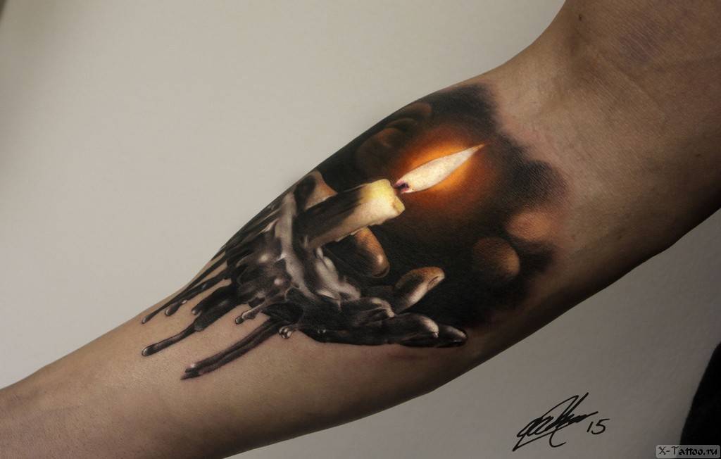 На предплечье предполагается прямая линия и гладкая кожа без выраженного рельефа, поэтому сюда чаще всего набивают портреты и лица, дополняют их разными предметами и надписями. 3д наколки также уместны любого размера и сложности.