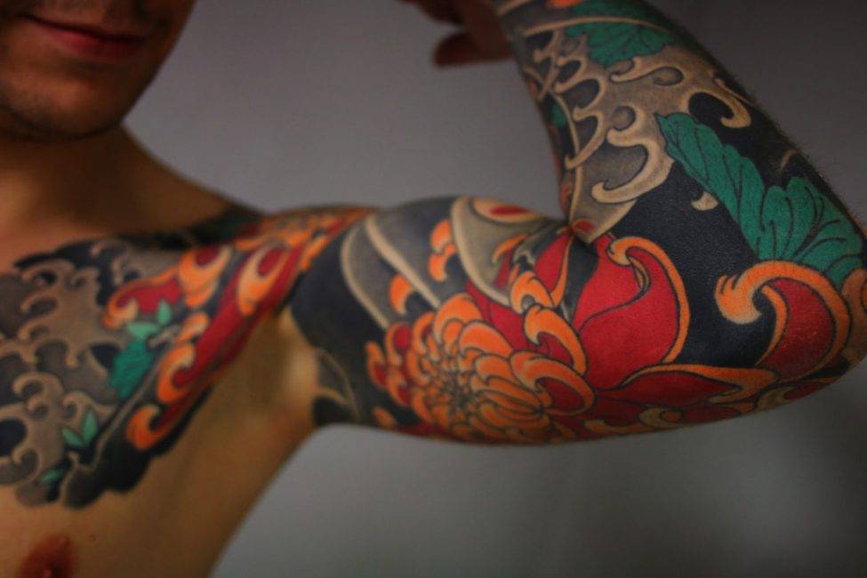 Японский стиль ориентал выбирают парни, желающие подчеркнуть силу, бесстрашие, упорство, верность принципам. На коже изображают маски самураев, карпов, распустившиеся хризантемы.