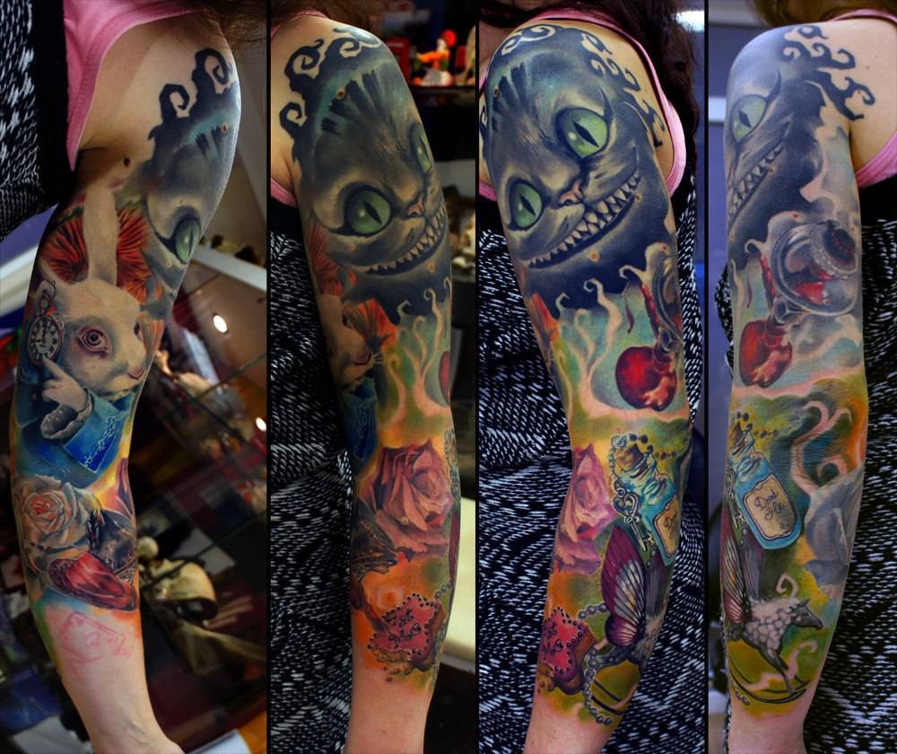 Наверное, все мы время от времени любим витать в облаках, погружаться в мечты, представлять, что персонажи из любимых фэнтезийных книг и фильмов реальны. К примеру, отличные идеи для рукава — изображение героев из “Алисы в стране чудес”, “Властелина колец”, известных аниме или диснеевских мультфильмов: “Унесенные призраками”, “Принцесса Мононоке”, “Тоторо”, “Русалочка”, “Красавица и чудовище” и т. д. Шикарно будут смотреться мифологические персонажи: фениксы, драконы, нимфы или феи на фоне фантастического пейзажа.