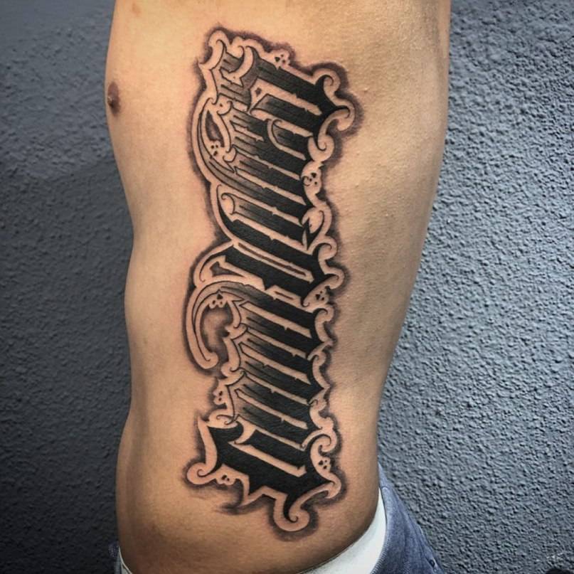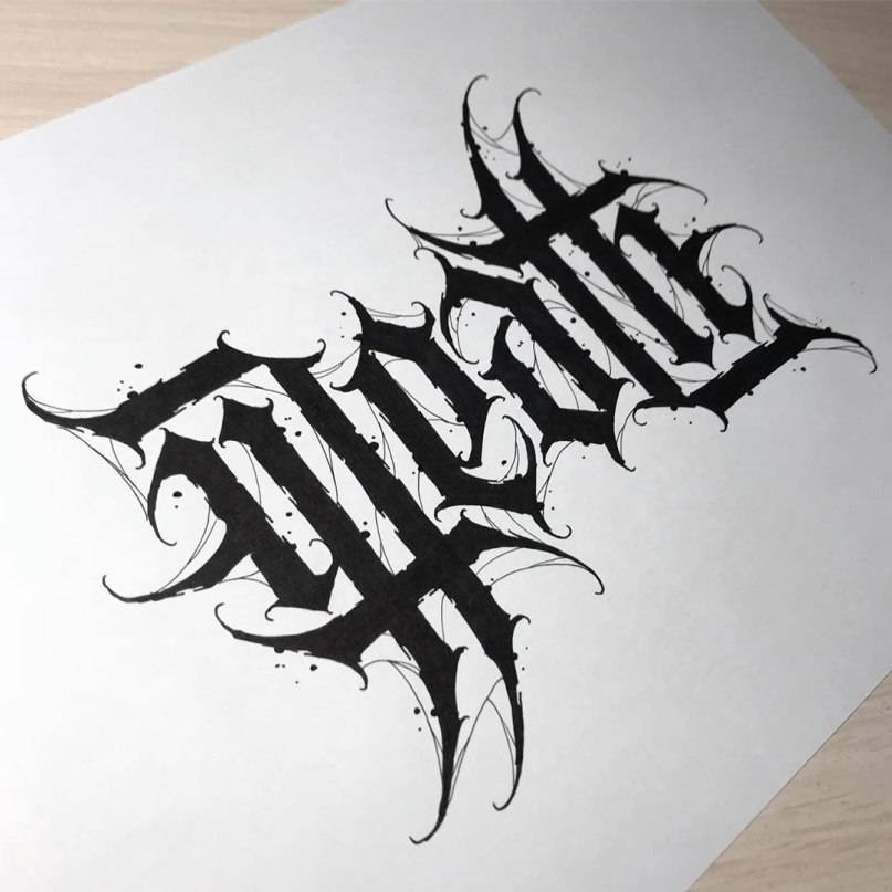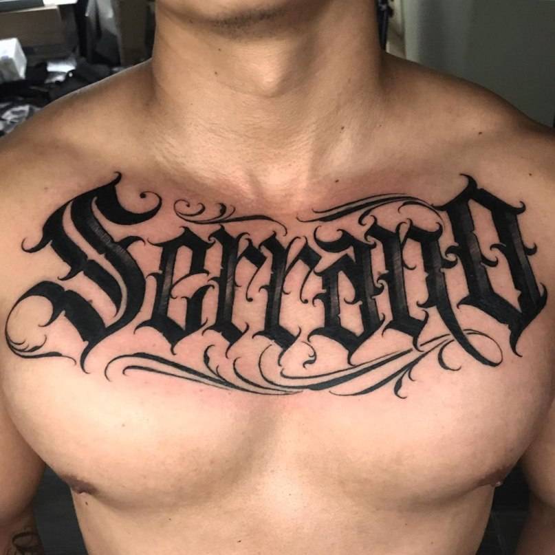 Буквы для тату в готической письменности отличаются надломленными жирными линии и закруглениями, выглядящими как остроконечный миндаль. В основном этот шрифт татуировки выбирают представители сильной половины человечества. Чаще всего надписи в готическом стиле наносят на предплечья, реже – на грудь.