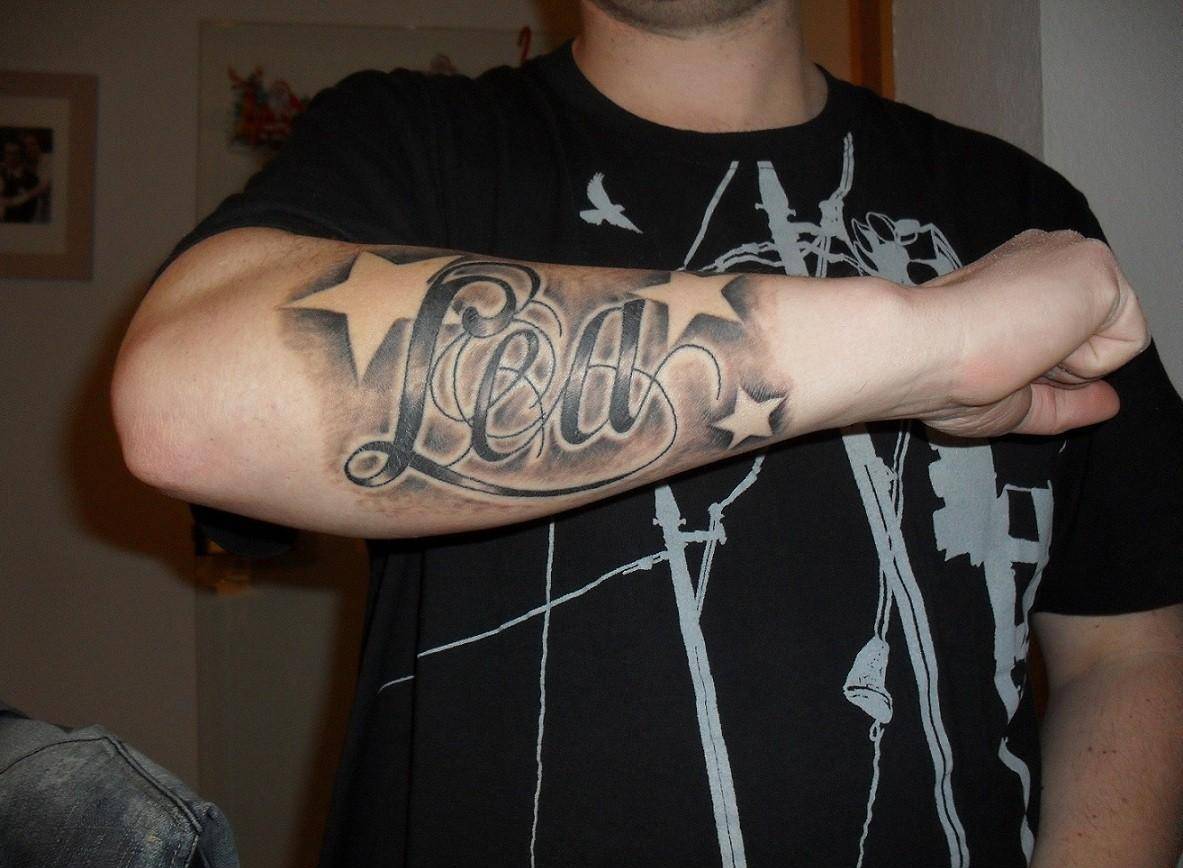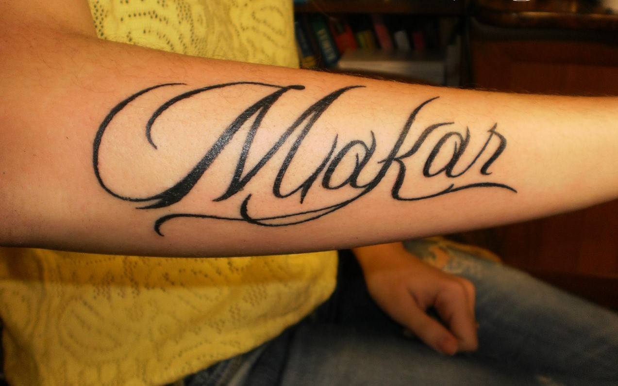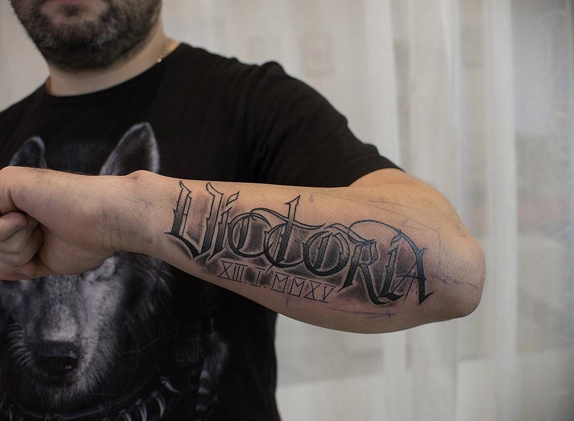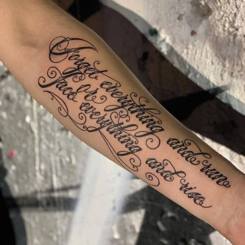 На предплечье может располагаться длинная тату в виде надписи
