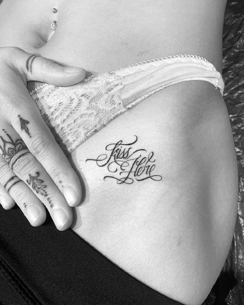 Отдельно хочется сказать про интимные татуировки на ягодицах и лобке. Лучше кроме любовных и юмористичных фраз здесь ничего не бить. Так же как и с поясницей, хорошо подумайте о правильности выбора.