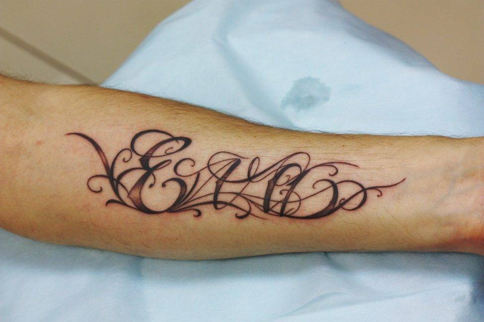 Тату-надпись на предплечье можно оформить с помощью интересного шрифта