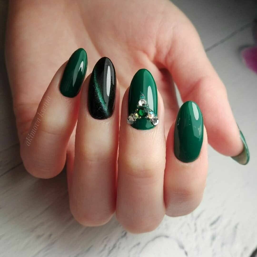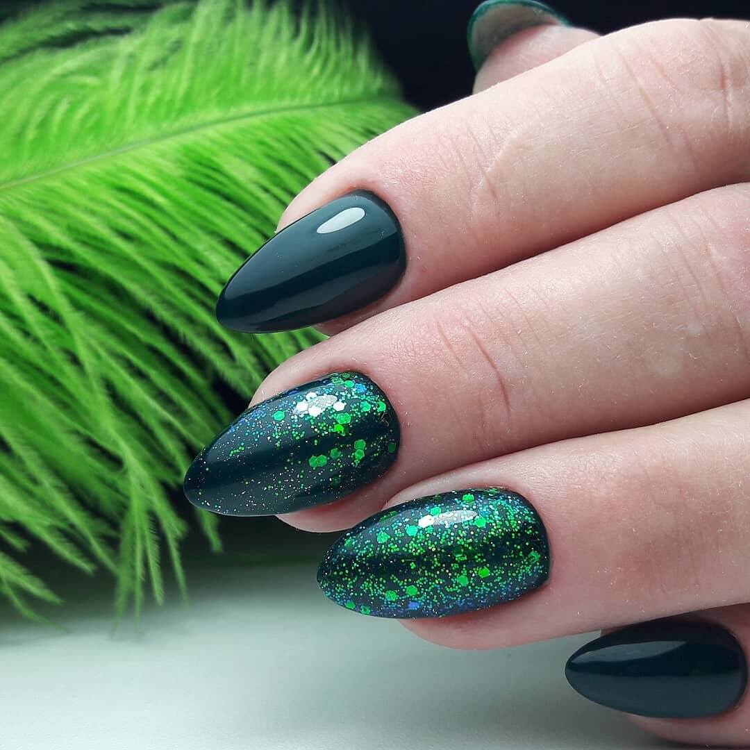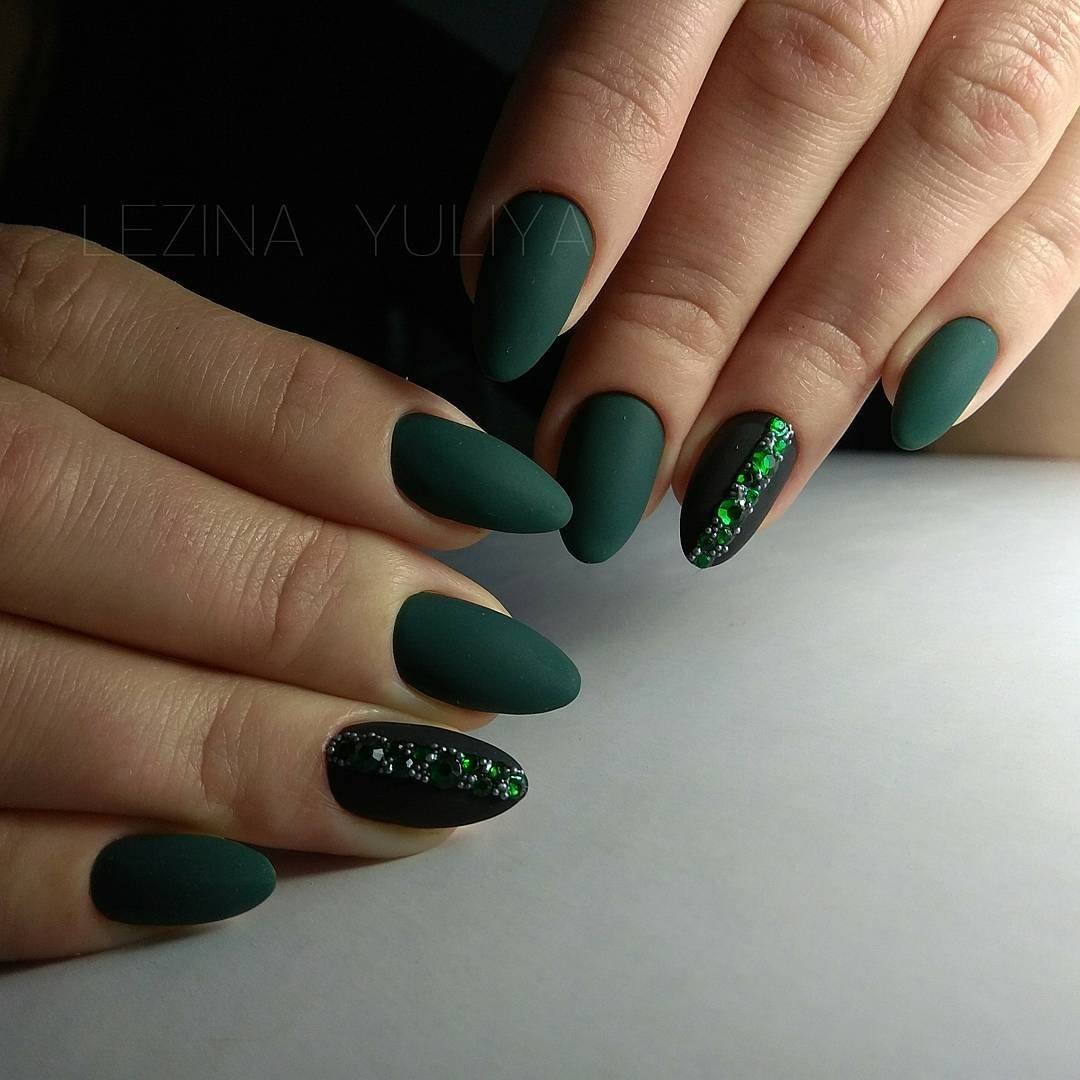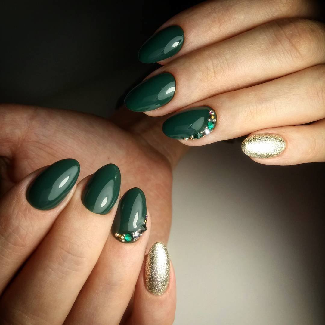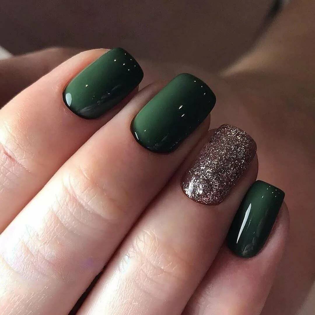 Темно-зеленый маникюр смотрится невероятно стильно и способен внести в образ нотки загадочности. Отличным дополнением к дизайну станет изумрудная втирка или глиттер.