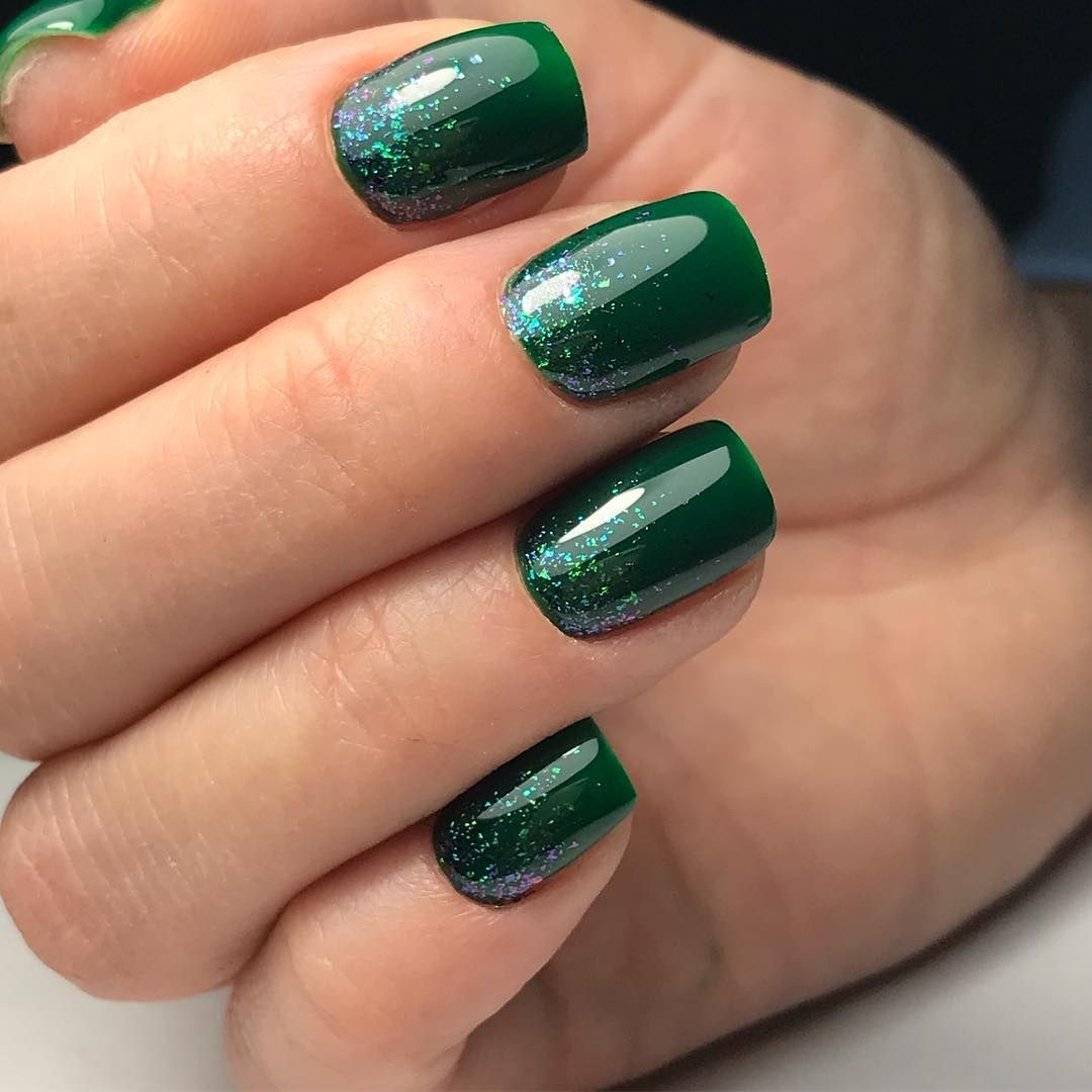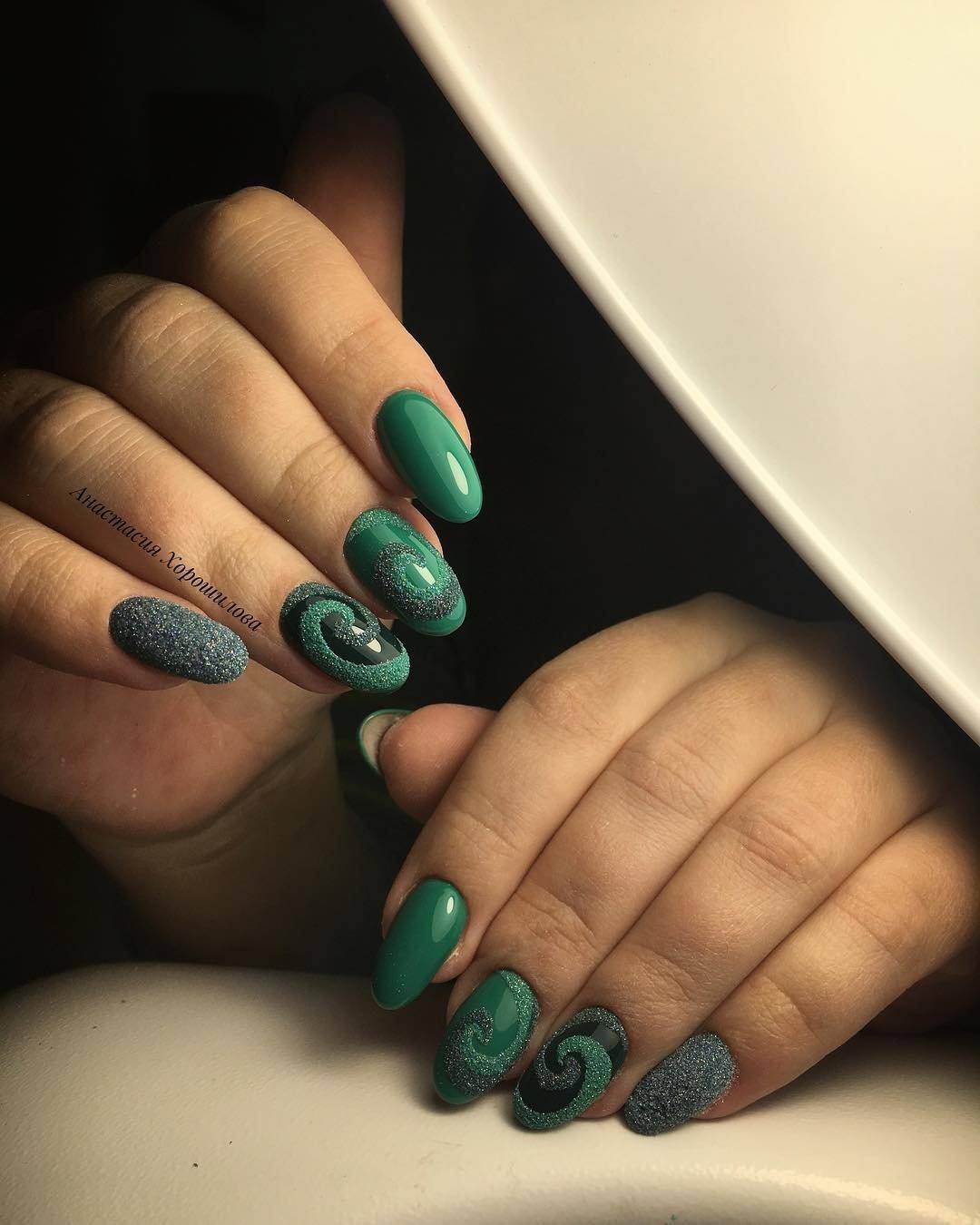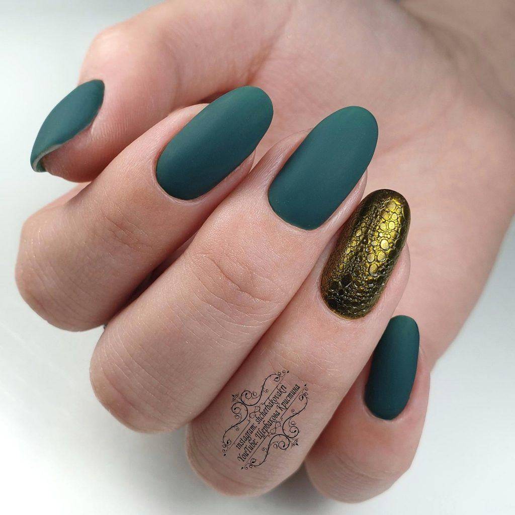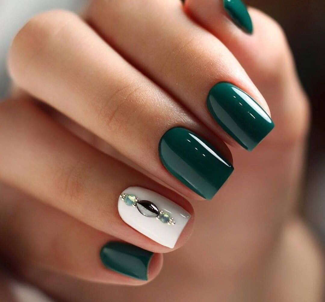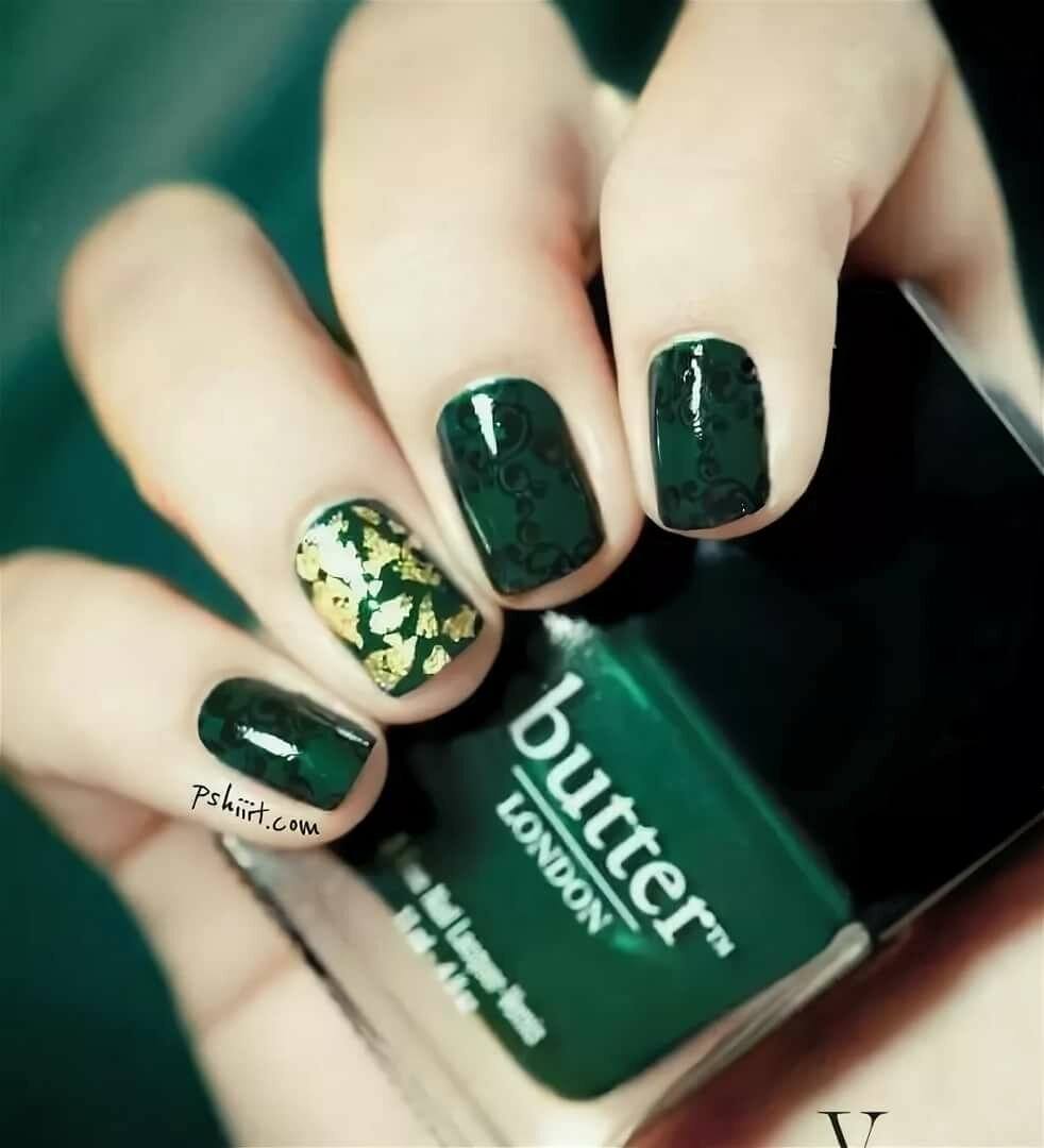 Темно-зеленый маникюр смотрится невероятно стильно и способен внести в образ нотки загадочности. Отличным дополнением к дизайну станет изумрудная втирка или глиттер.