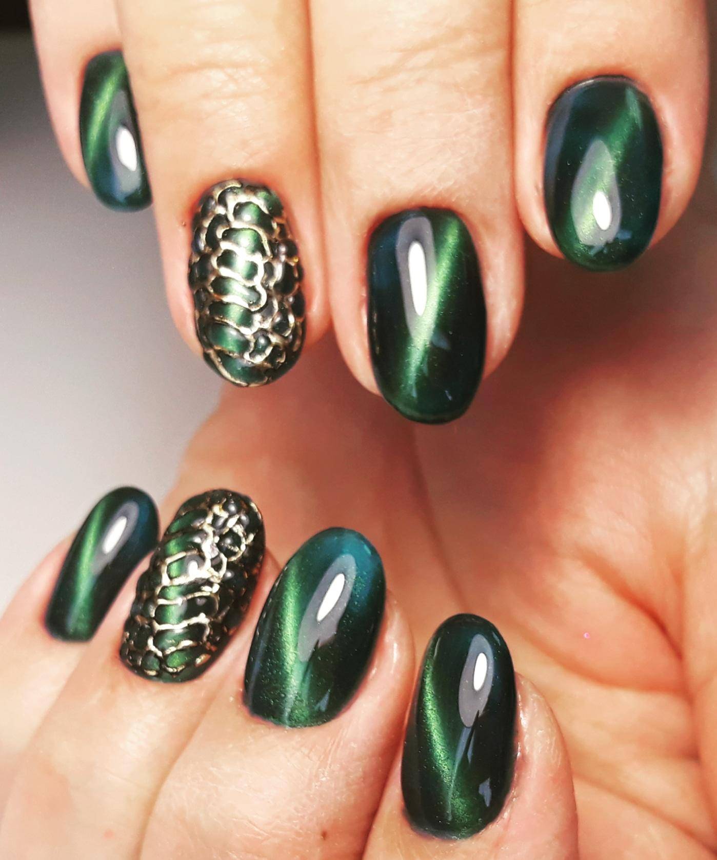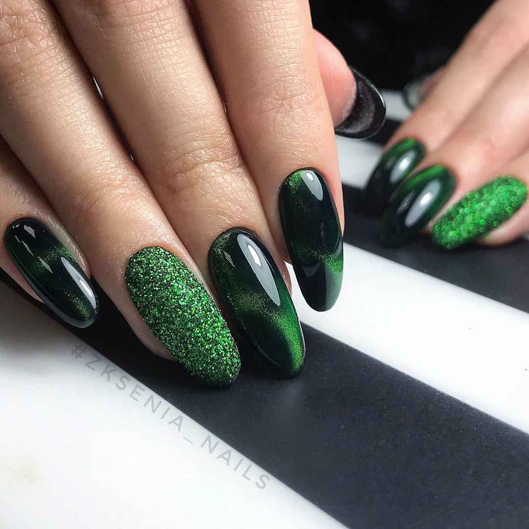 Зеленый цвет чаще всего используют для маникюра в стиле “кошачий глаз”. Конечно же, для этого необходим специальный лак с металлизированными микрочастицами, а также магнит с рисунком. На ногтевую пластину наносят слой лака, а затем на небольшом расстоянии удерживают магнит в течении нескольких секунд. За столь короткое время проявляется рисунок. Именно он визуально напоминает “кошачий глаз”. Его преимущественно выбирают для празднования Нового года и других, не менее важных событий.
