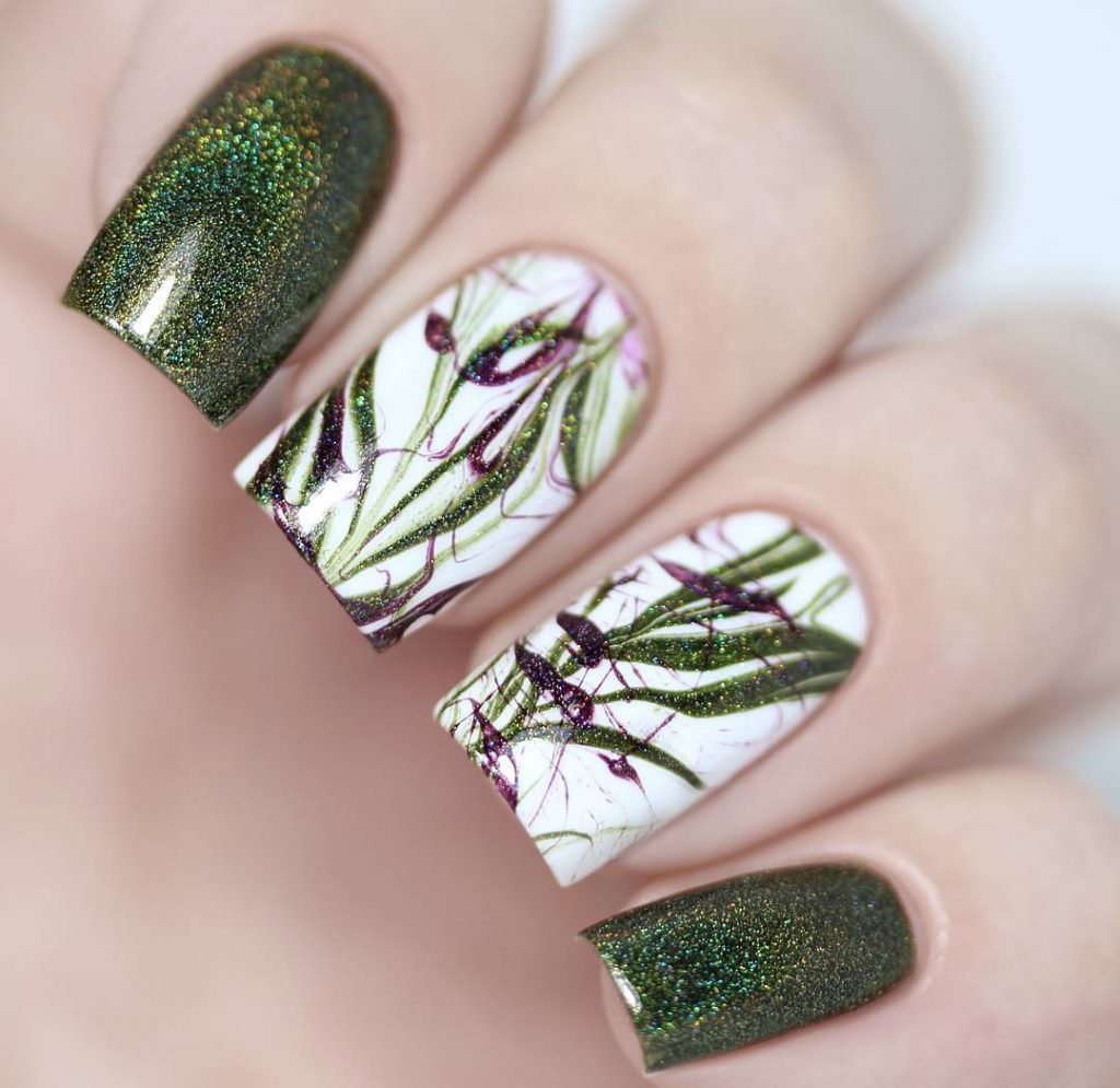Также стоит обратить внимание на листья и веточки, которые невероятно красиво смотрятся на зеленом фоне. Для большей эффектности данный дизайн нередко дополняют блестками, стразами, камифубуки, втиркой и другим декором