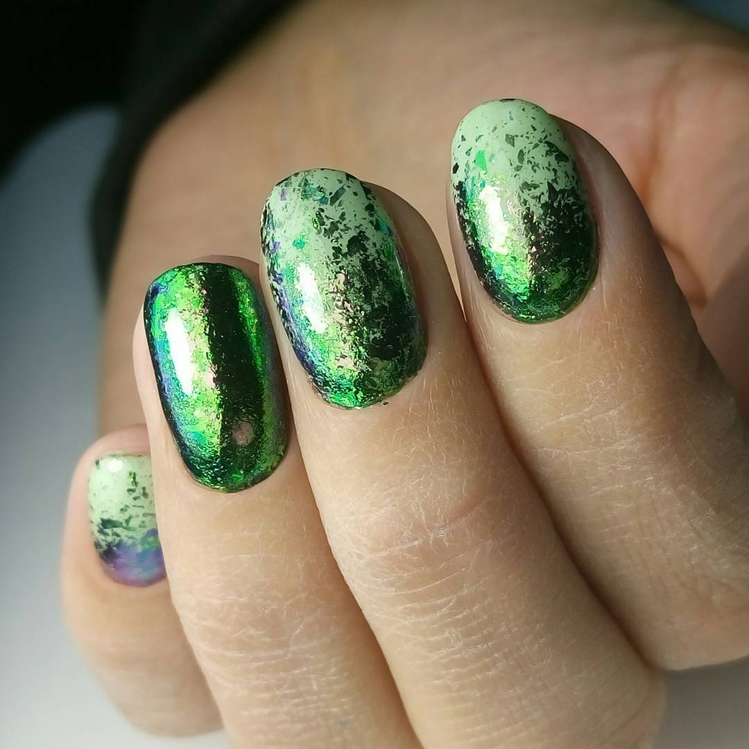 Еще один пример маникюра с темно-зеленым цветом гель-лака — он покорил многих своим эффектным видом и очень простым исполнением. Чтобы повторить такой дизайн «слеза единорога» потребуются два цвета лака, серебряная фольга и топ.