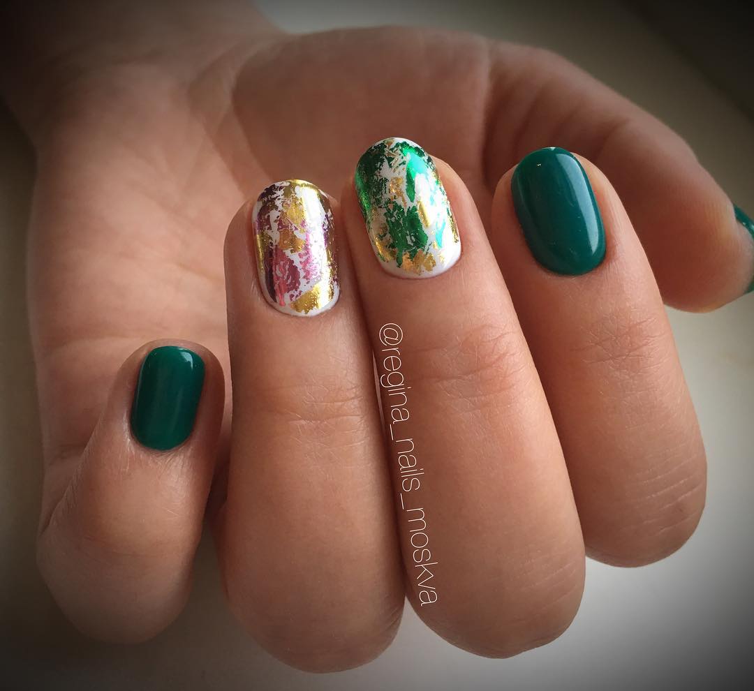 В последнее время большой популярностью пользуется нейл-арт, который на темном зеленом фоне может выглядеть дерзко и ярко, мило и стильно. Например, если добавить контрастные мазки краской, получится максимально актуальный вариант. Еще в тренде разный дизайн всех ногтей — новинка на фото 2 и 3.