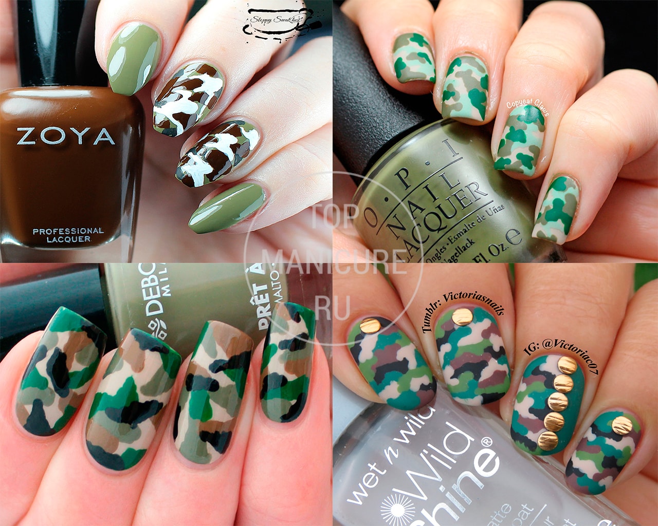 Камуфляжный маникюр делается с зеленым, коричневым, черным и бежевым лаками. Также его можно сделать, используя фломастер для дизайна ногтей. Рисовать на ногтях с его помощью проще. Какую бы технику вы ни выбрали, сначала наносится основа для дизайна. Обычно это бежевый оттенок. Уже на нем рисуются небольшие пятна указанных выше оттенков. Далее наносится топ или матирующее покрытие.