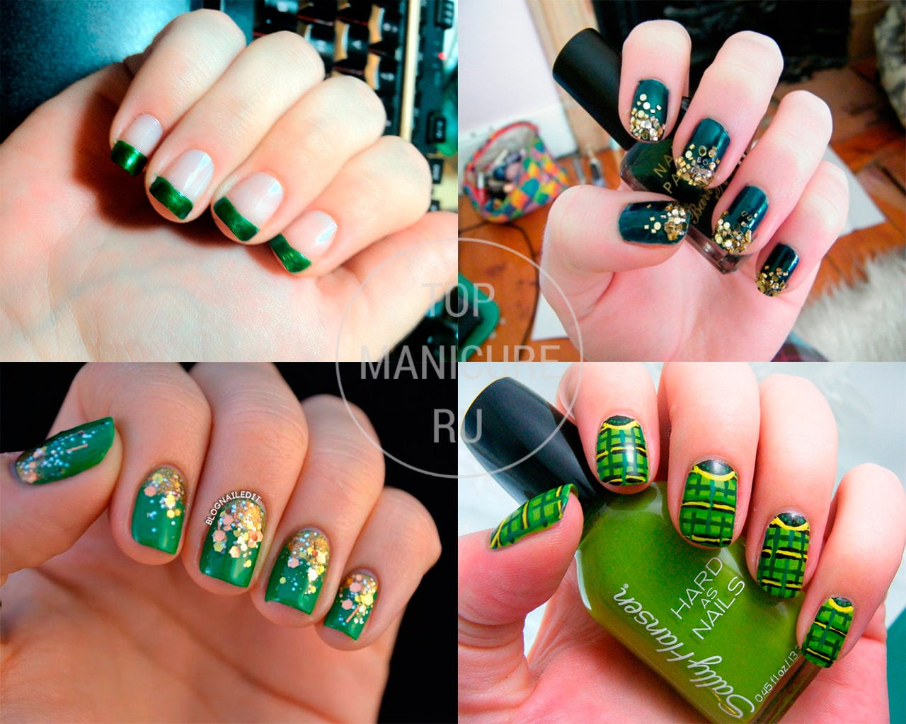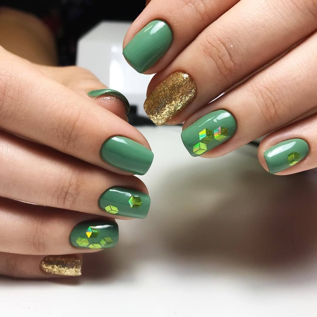 Зеленый маникюр также отлично смотрится и на коротких ногтях, будь это френч, украшенные золотыми блестками ногти или клетчатый орнамент.