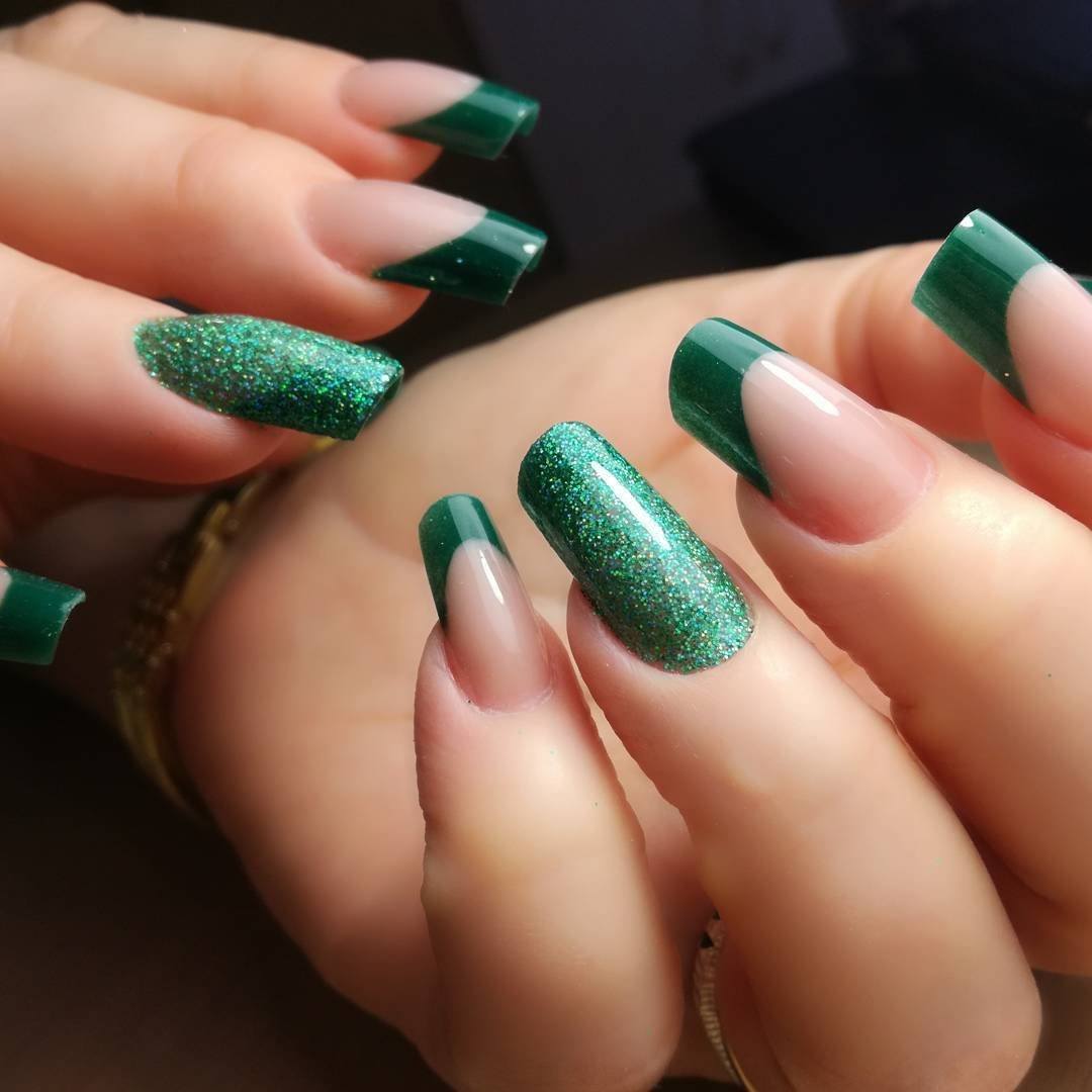 - аккуратный, сдержанный и нейтральный маникюр в изумрудных оттенках – классический френч. Основа может быть белая или прозрачная, нежно – розовый приветствуется. Это отличное решение как для коротких, так и для длинных ногтей;