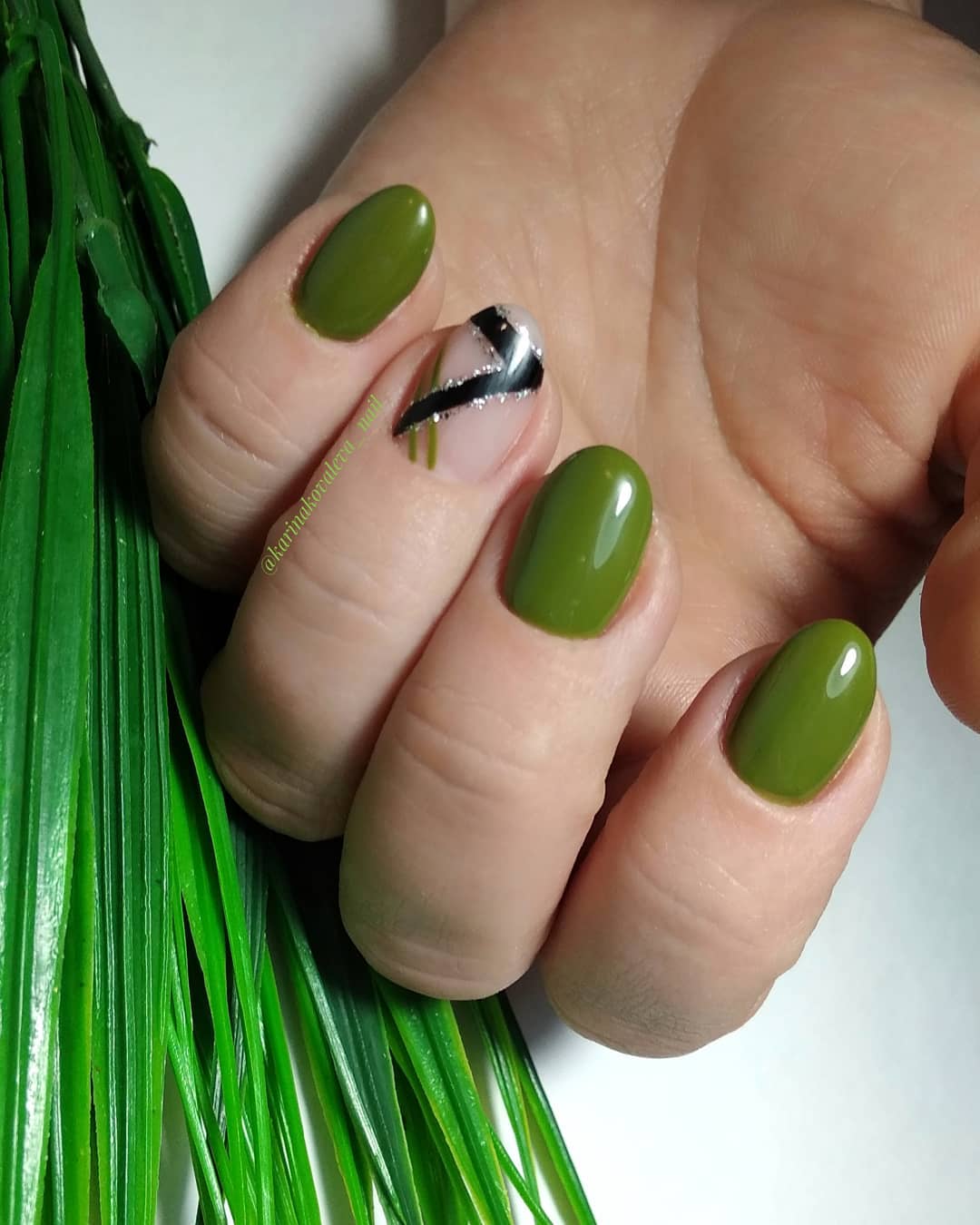 Не будет забыт и маникюр с зеленым лаком с геометрическим или минималистским рисунком. Тренд сезона орнамент из хаотично переплетающихся тонких полосок или декор в виде широкой вертикальной полосы на безымянном пальце.