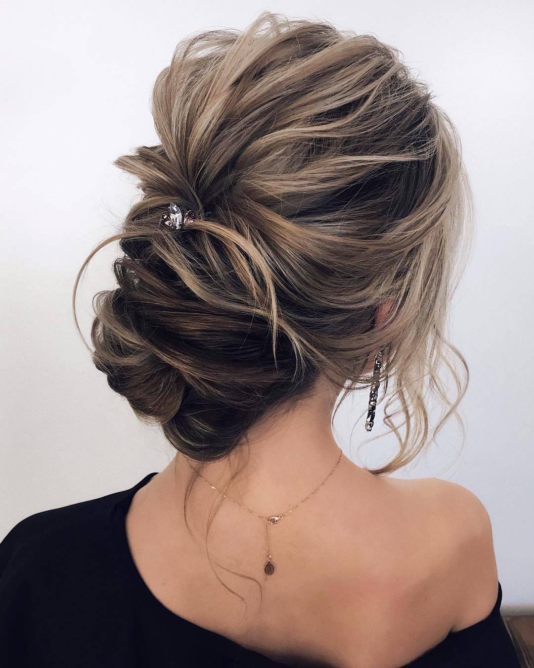 Любительницам нежных, романтичных образов определенно стоит присмотреться к прическам с легким эффектом небрежности. Они актуальны довольно давно и 2020 год – не исключение. Чаще всего их делают на основе пучка, но не слишком тугого. Всего лишь несколько выпущенных прядей и все – идеальное решение для праздника готово. Кстати отметим, что прически в небрежном стиле не слишком часто дополняют украшениями. Исключение составляют нежные, лаконичные аксессуары с бусинами или же камушками небольшого размера.