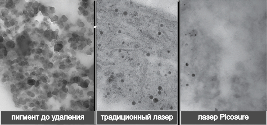 Как и у всех остальных лазеров, Picosure имеет четко определенную мишень – частицы пигмента. Лазерный луч проходит сквозь кожу, не затрагивая ее клетки, и концентрируется на частицах чернил татуажа. Воздействие длится триллионные доли секунды (пикосекунды), и за это время на пигмент подается большое количество энергии, которое мгновенно распыляет частицы краски в пыль.