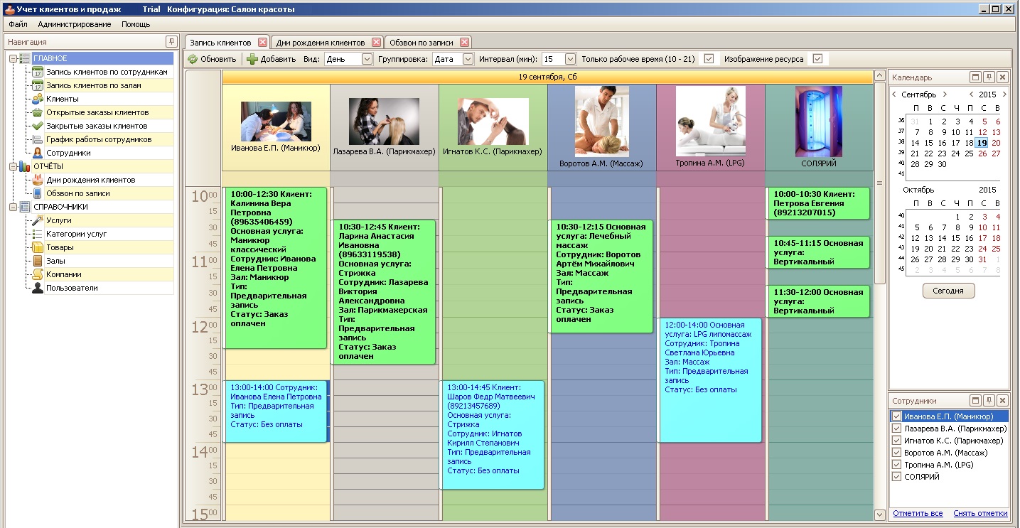 - вести календарь записей для каждого сотрудника;