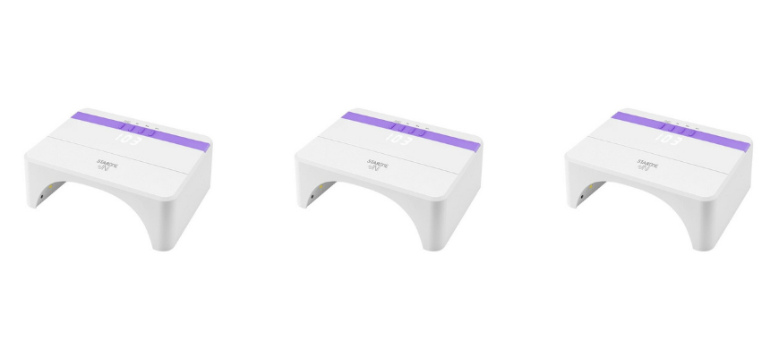 Ещё одна дугообразная модель, не имеющая ни нижней, ни задней стенок. Она представлена в двух оттенках – голубой и фиолетовый. Лампа очень лёгкая и компактная. Её с одинаковым успехом можно применять для маникюра и педикюра. Кабель имеет съёмный характер, что упрощает транспортировку устройства. На ножках стоят резиновые накладки.