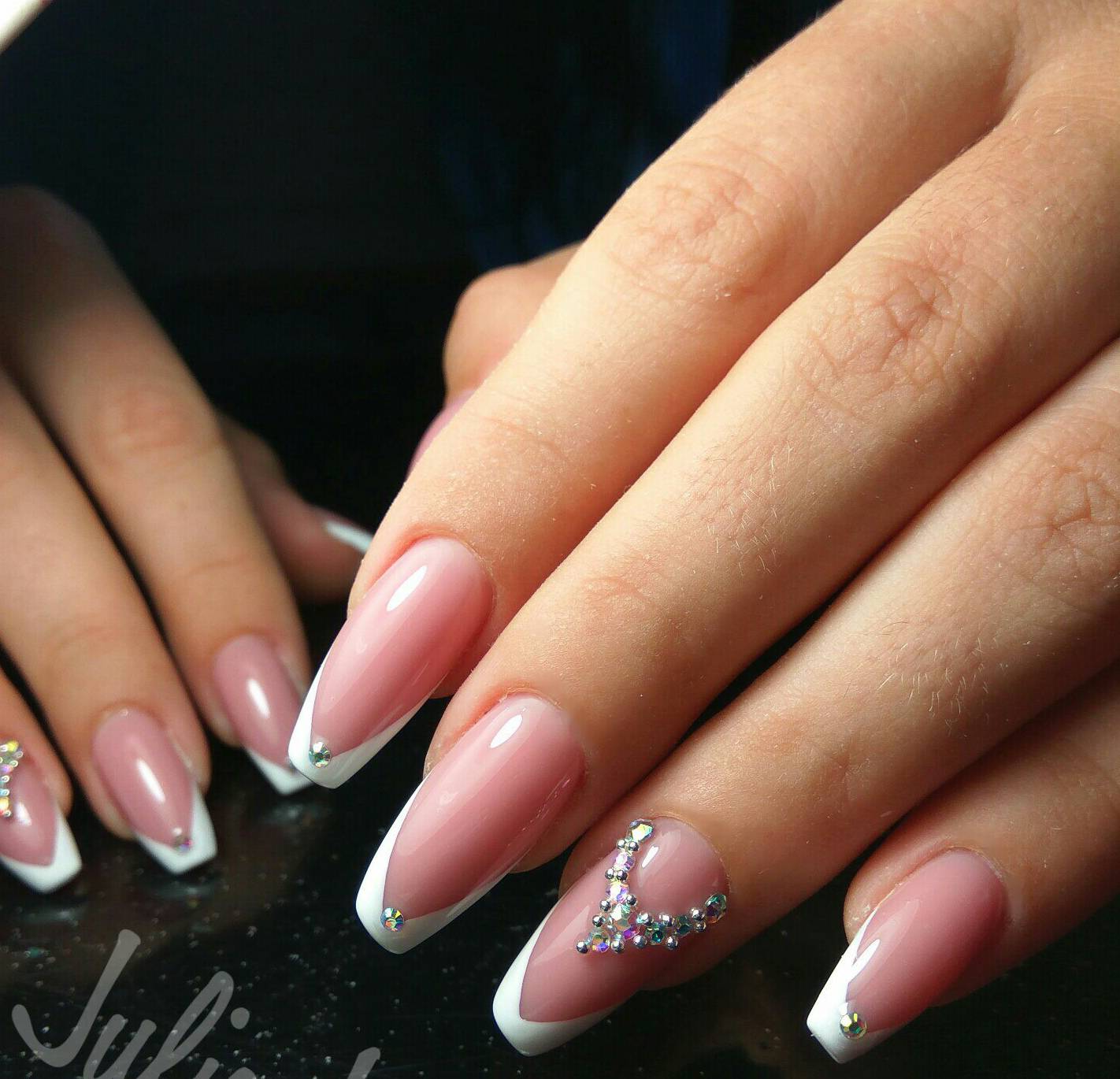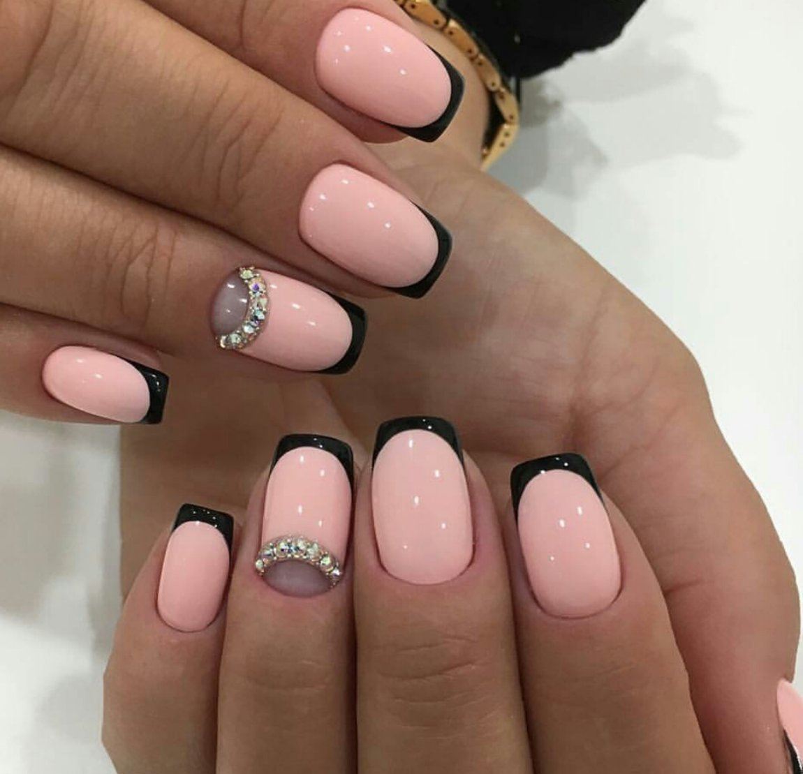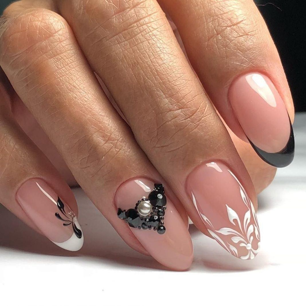 Классические бело-розовые тона по-прежнему в моде. Основную конкуренцию им составляют нейл-арты в белом, черном, бордовом цвете. Все эти цвета и многочисленные их полутона великолепно сочетаются как со стразами, так и с блестками.