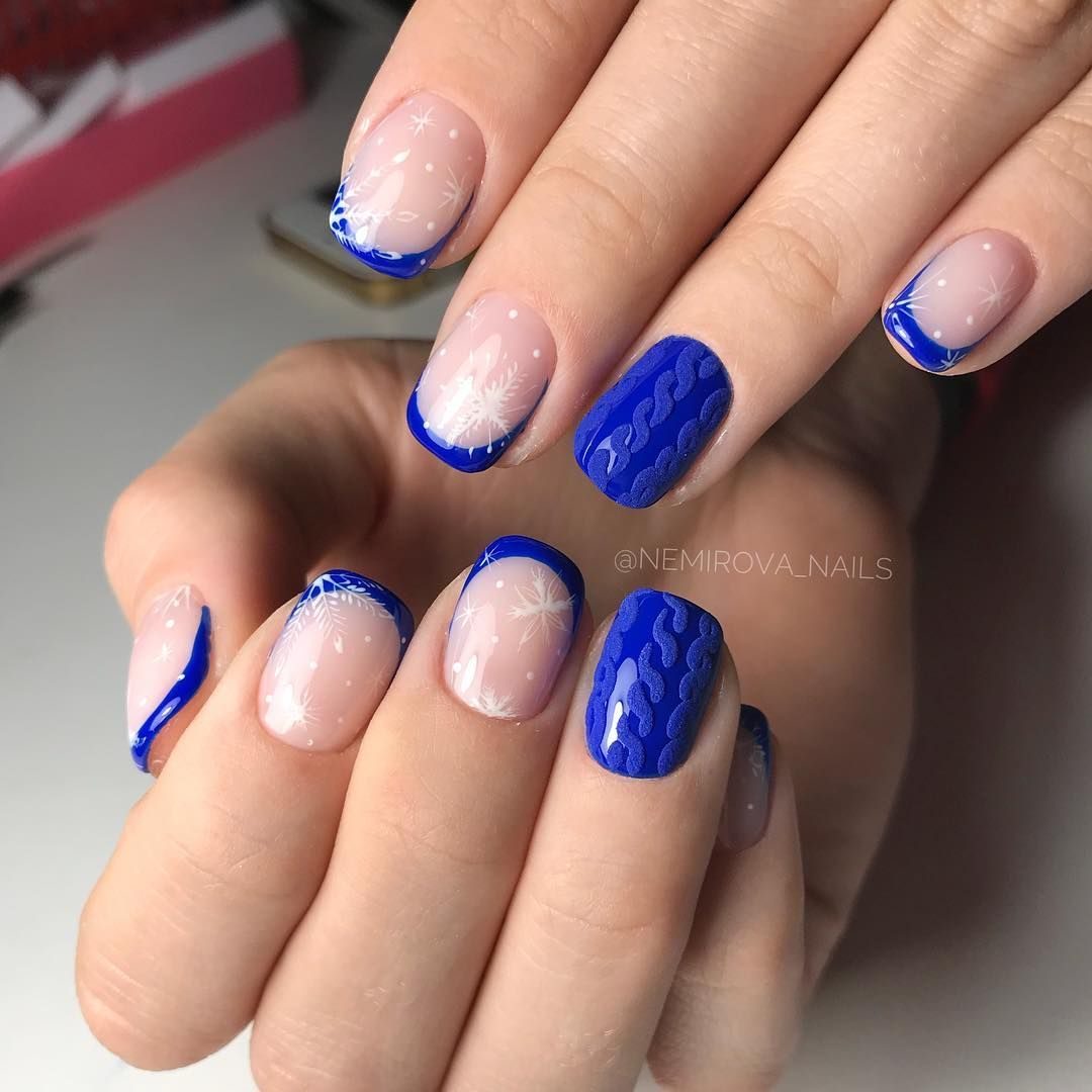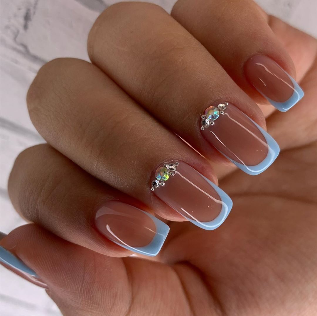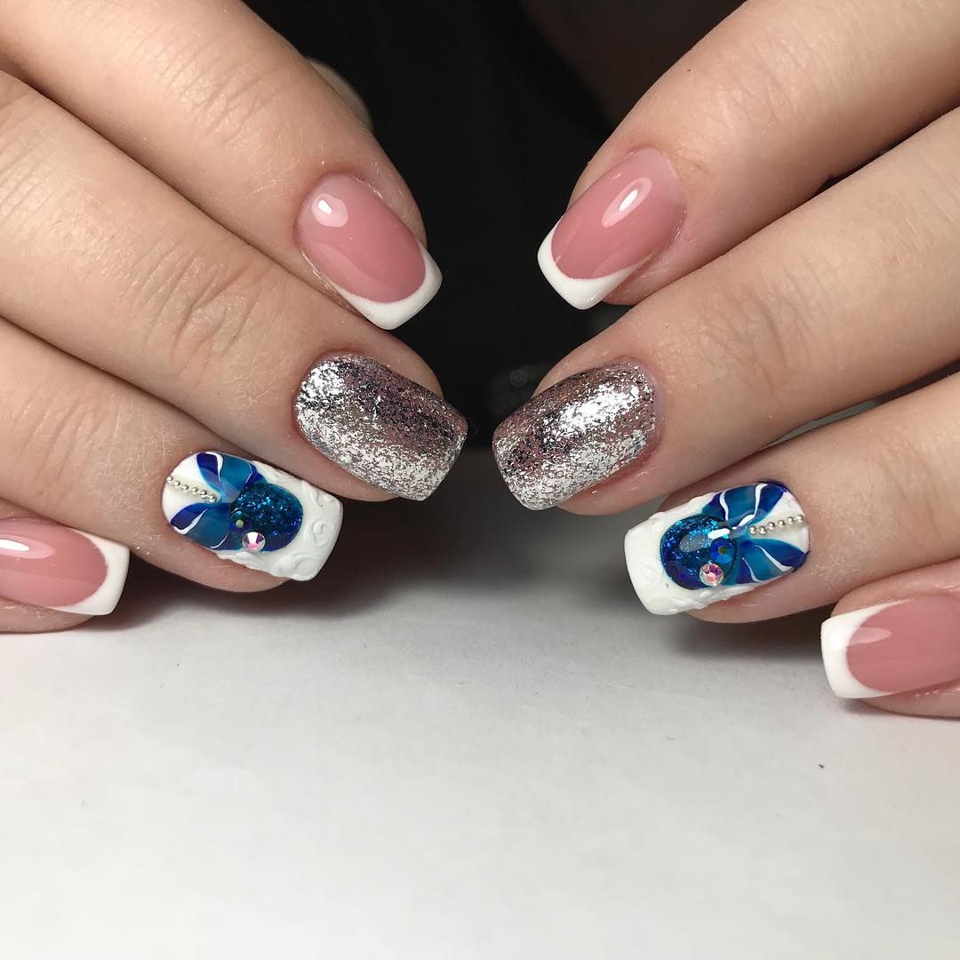 Предпочтительно это классический или лунный французский маникюр в голубых пастельных тонах, с аквариумным акцентом на нескольких пальцах.