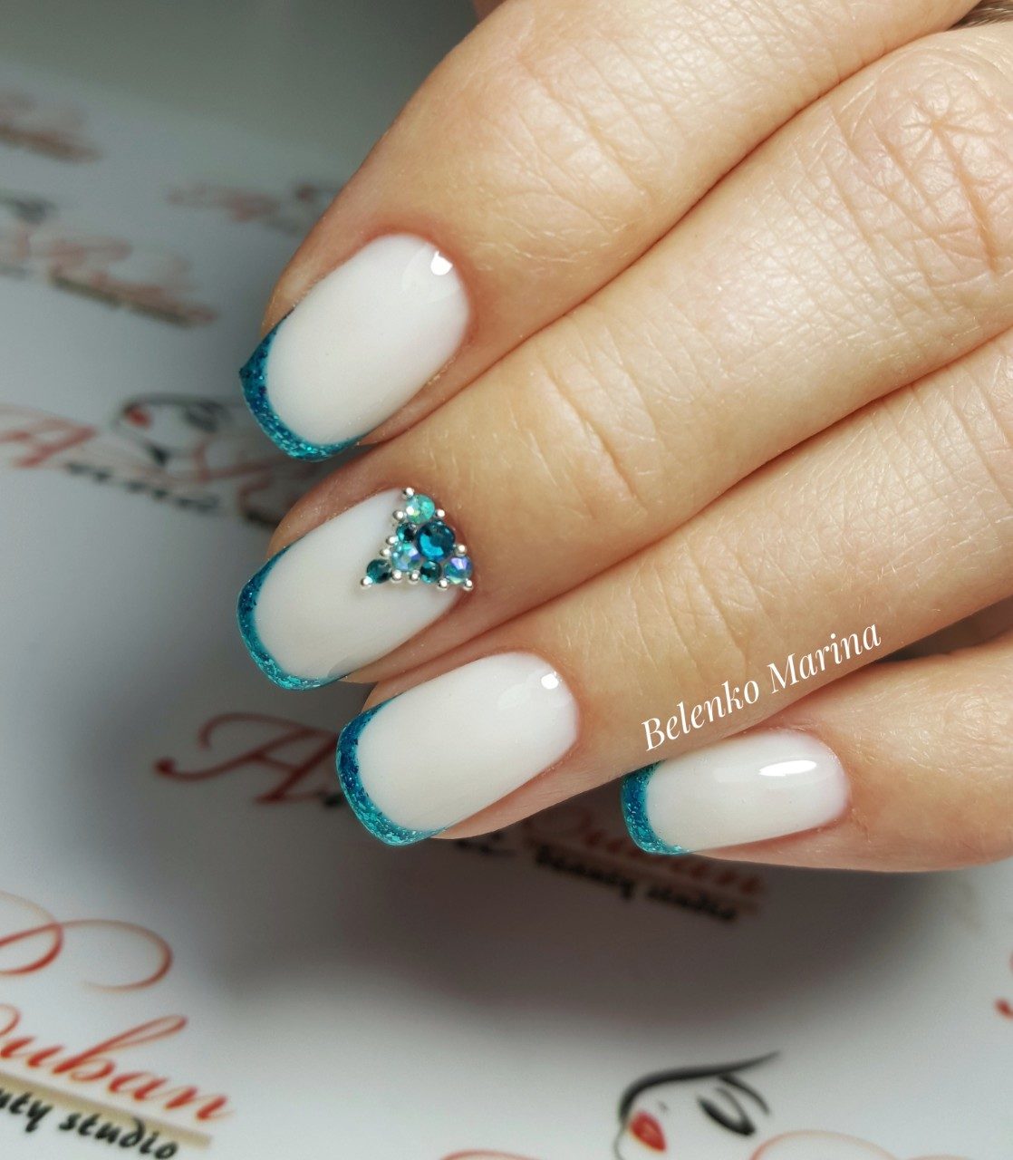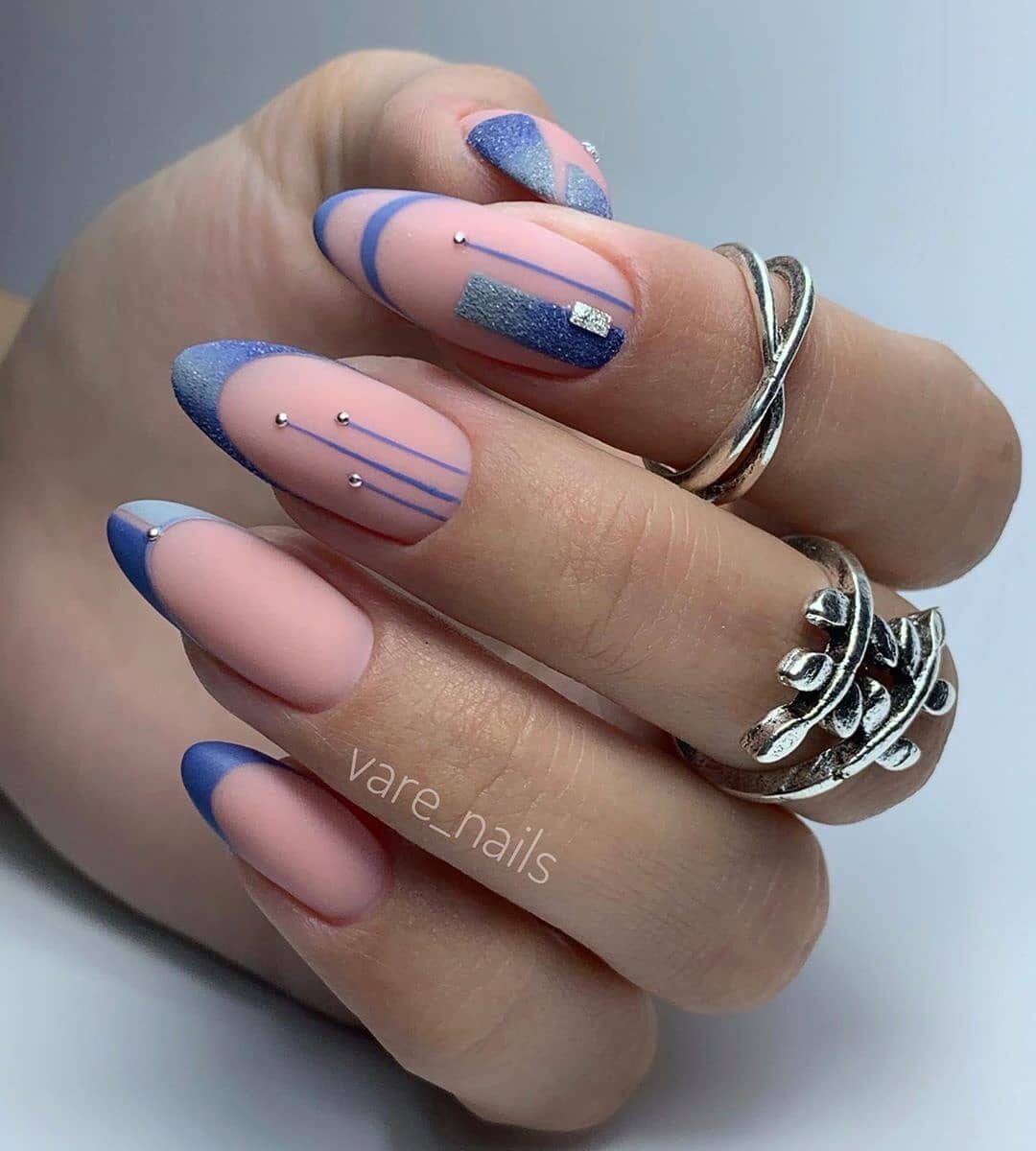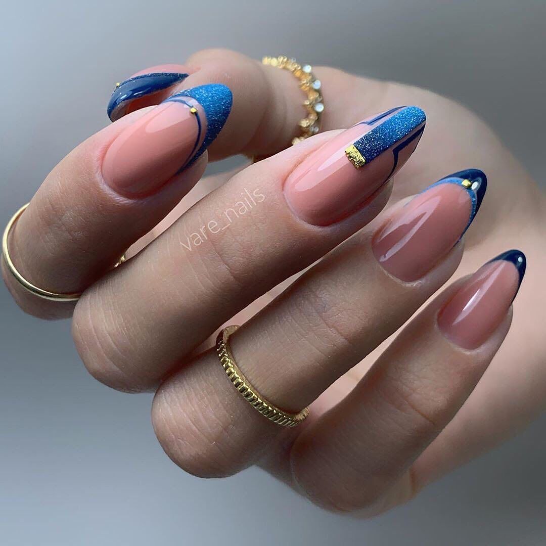 Предпочтительно это классический или лунный французский маникюр в голубых пастельных тонах, с аквариумным акцентом на нескольких пальцах.