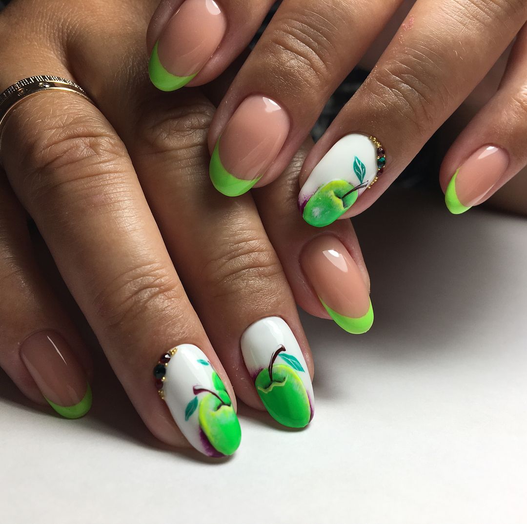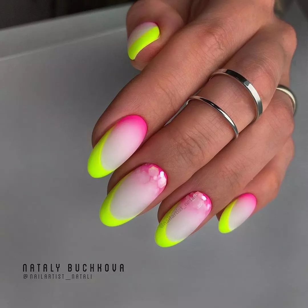 Еще одним трендом сезона станет разноцветный френч, который отличается сочетанием палитры оттенков. Так, например основа может выполнена красным или зеленым цветом, а окантовка синим или оранжевым. Такое яркое и веселое сочетание не только добавит свежести летнему образу, но и вполне лояльно разбавить скучные зимние будни.