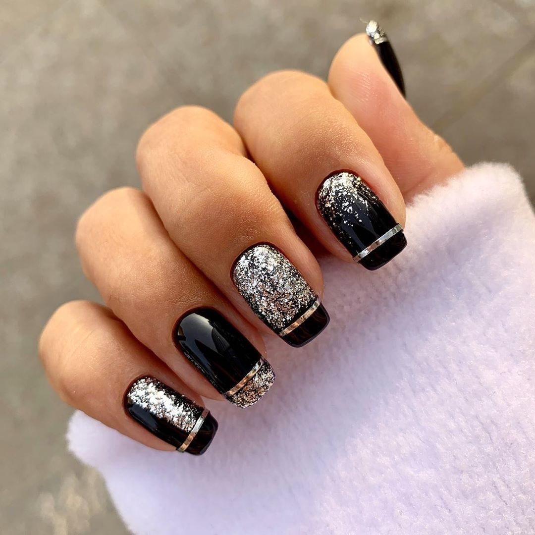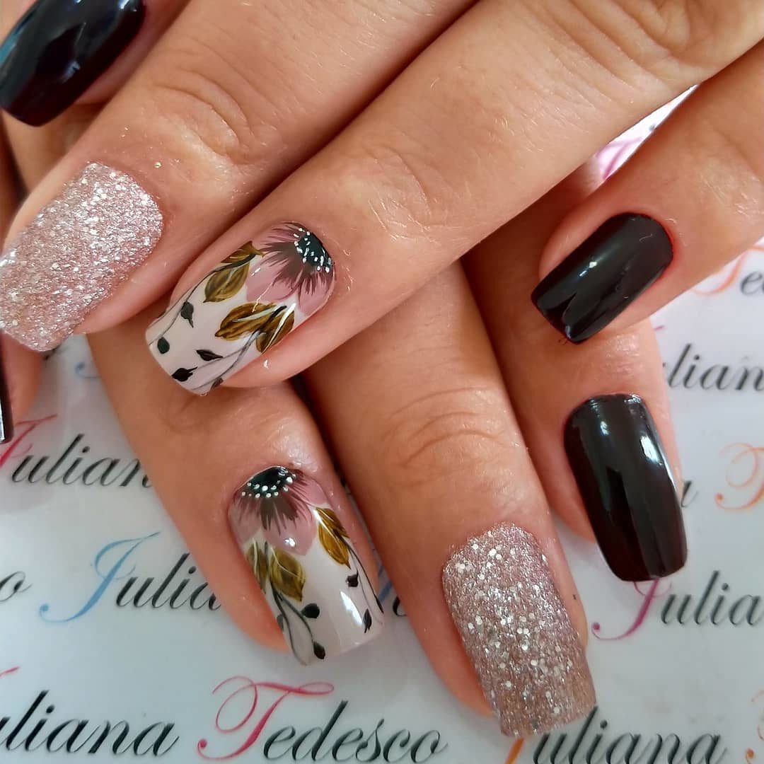 Говоря о маникюре с блестками, мы подразумеваем десятки интересных нейл-артов, отличающихся по цветовой гамме, дизайну (флористика, геометрия) и расположению основного декора.