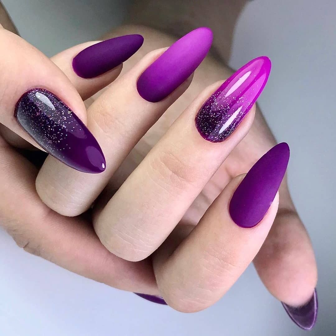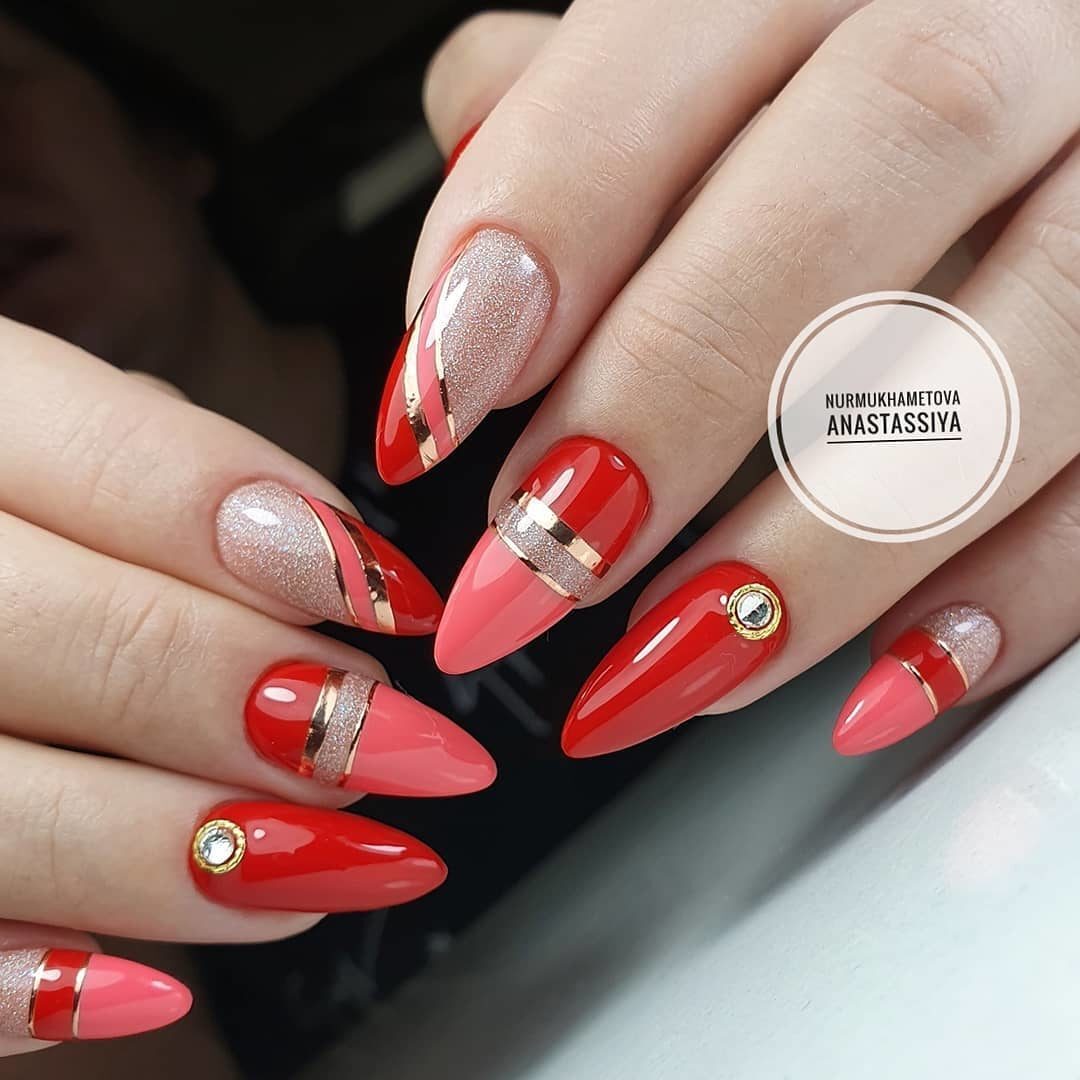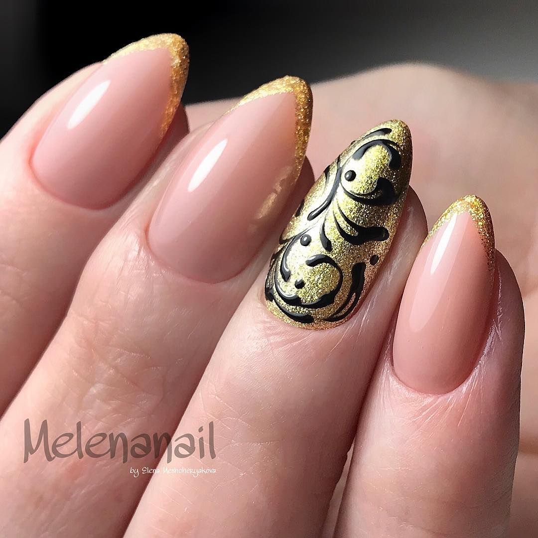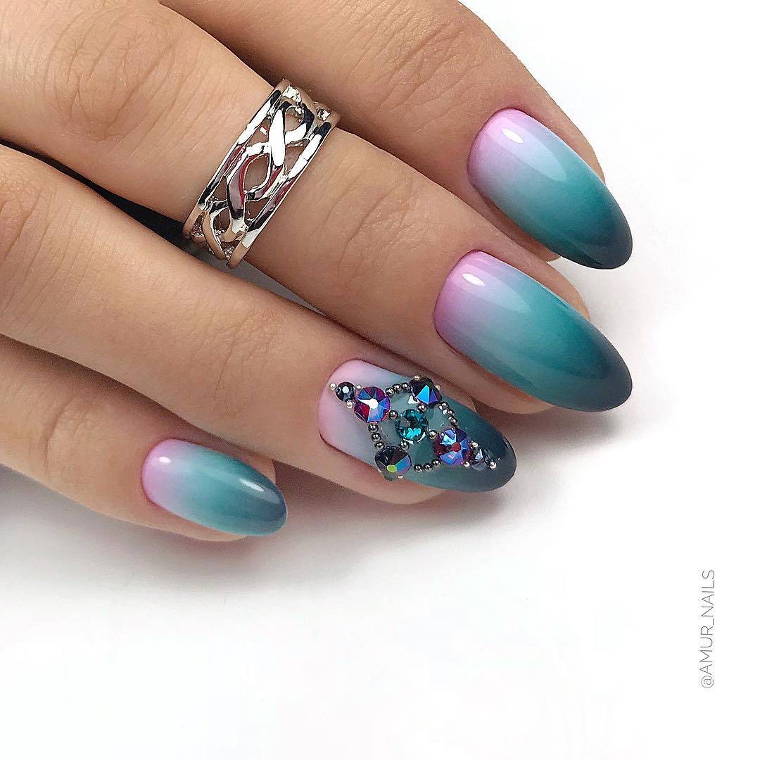 В этом сезоне отдавайте предпочтение миндалевидной форме ногтей, такая форма выглядит очень утончено и стильно. Дизайн ногтей на миндалевидную форму шикарно выглядит и в темных и в светлых оттенках, ярких и пастельных, с блестками, камнями и фольгой, с втиркой и наклейками.