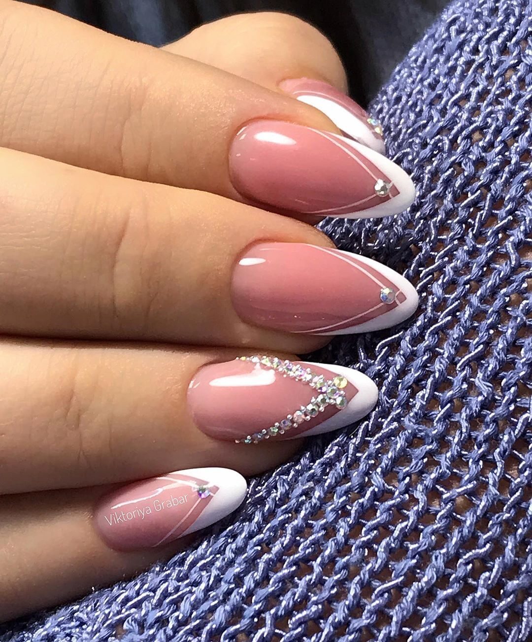 Второй актуальной тенденцией станет френч с V-образной улыбкой, дополненный различными геометрическими узорами, либо мелкими стразами или блестками, за счет нестандартной формы улыбки короткие ногти можно визуально удлинить.