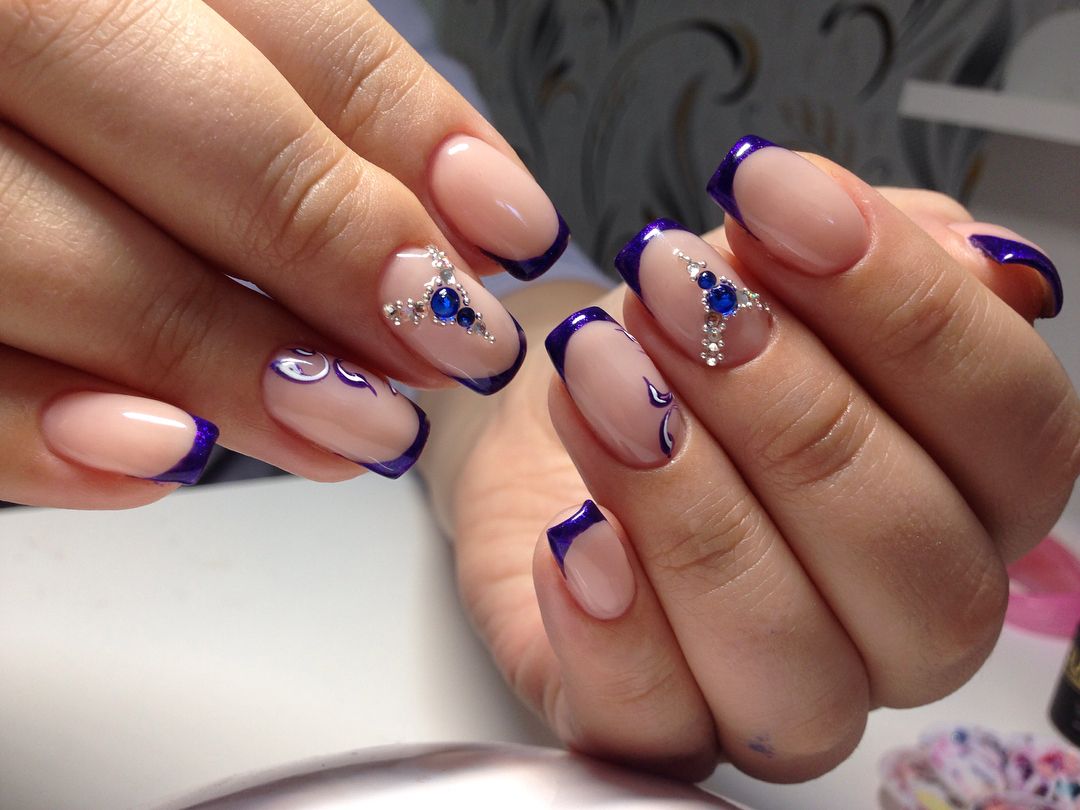 Блестки – далеко не единственное украшение стильного френча. Девушки не упускают возможности украсить ноготки тематическими узорами и обязательно акцентировать их стразами.