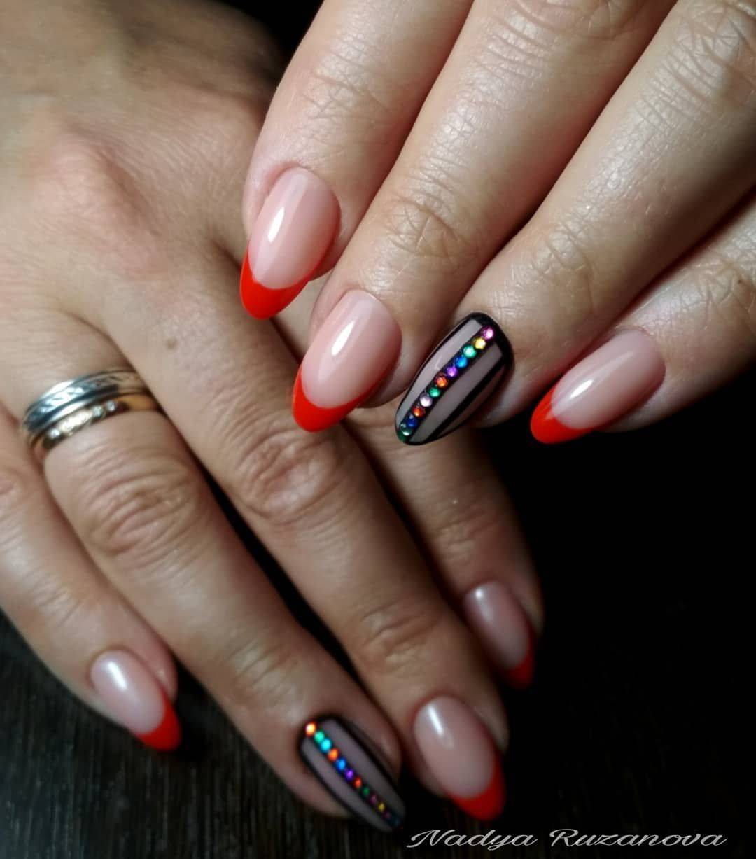 Яркие краски в домашних условиях следует использовать очень осторожно, потому что французский маникюр красный с любым дополнительным цветом, кроме близкородственных (розового и бордового) будет выглядеть так, будто вы неаккуратно открывали варенье и перепачкались
