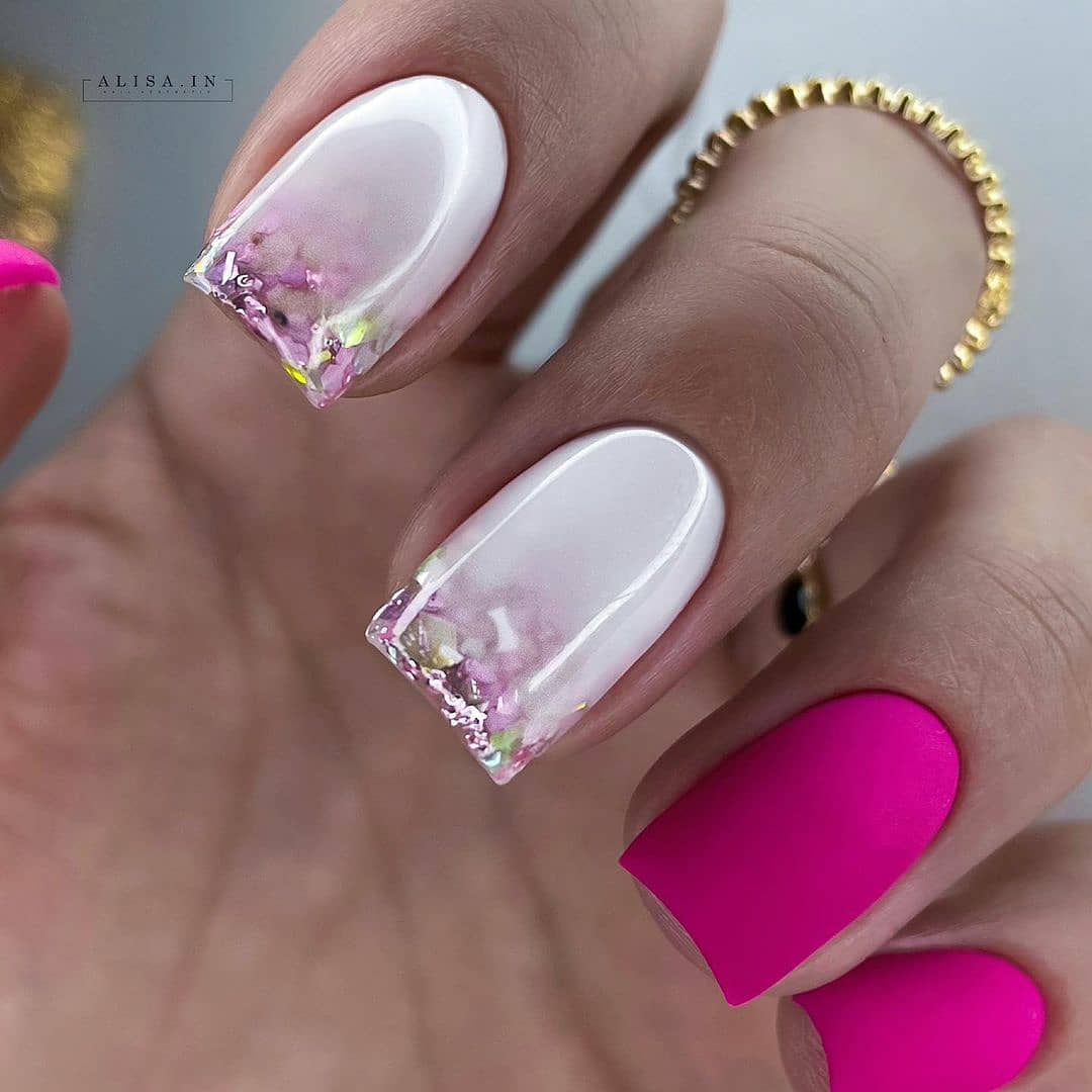 Также весьма популярными трендом стало сочетание таких техник как камифубуки, «битое стекло» или переливающаяся фольга с классическим френчем.