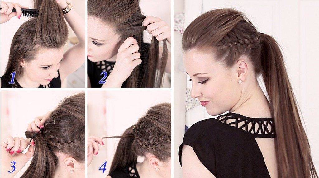 Если есть желание разнообразий образ с хвостом, то можно добавить в прическу косы. Такие причёски своими руками можно соорудить буквально за пятнадцать минут. Дополнить образ можно аксессуарами.