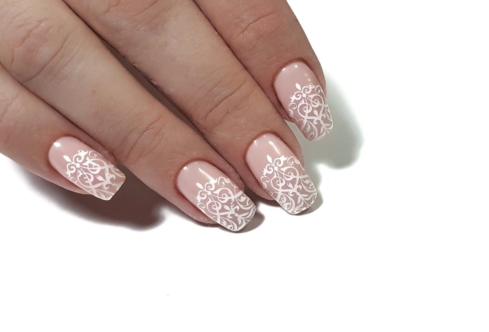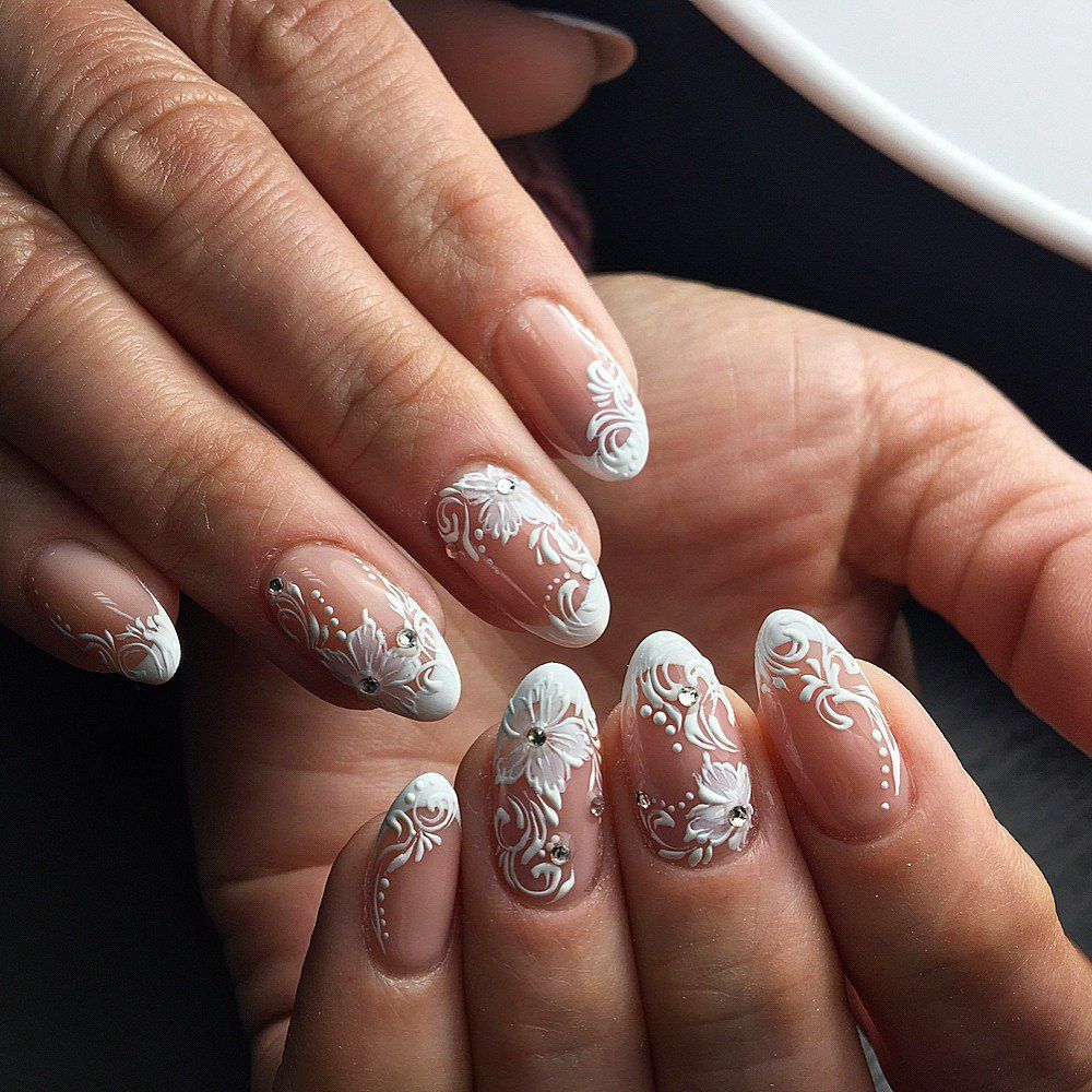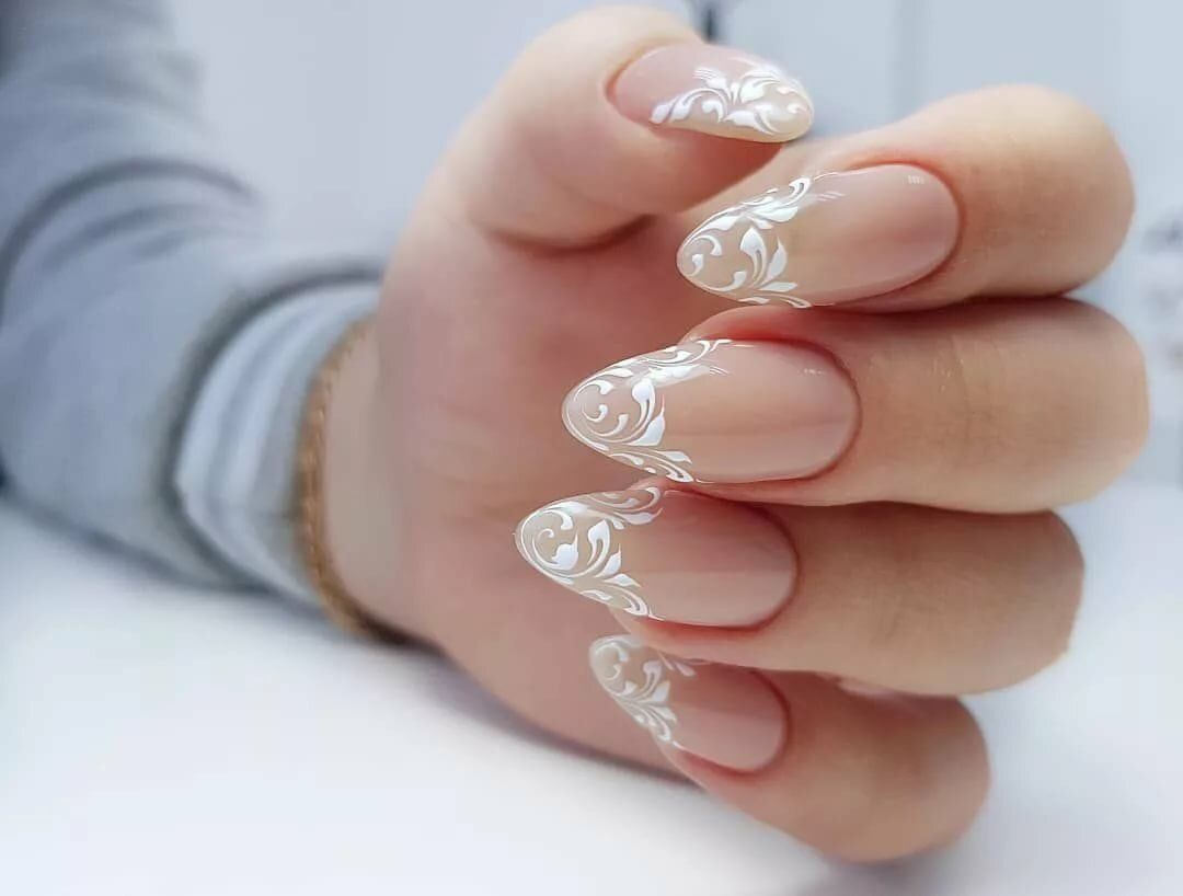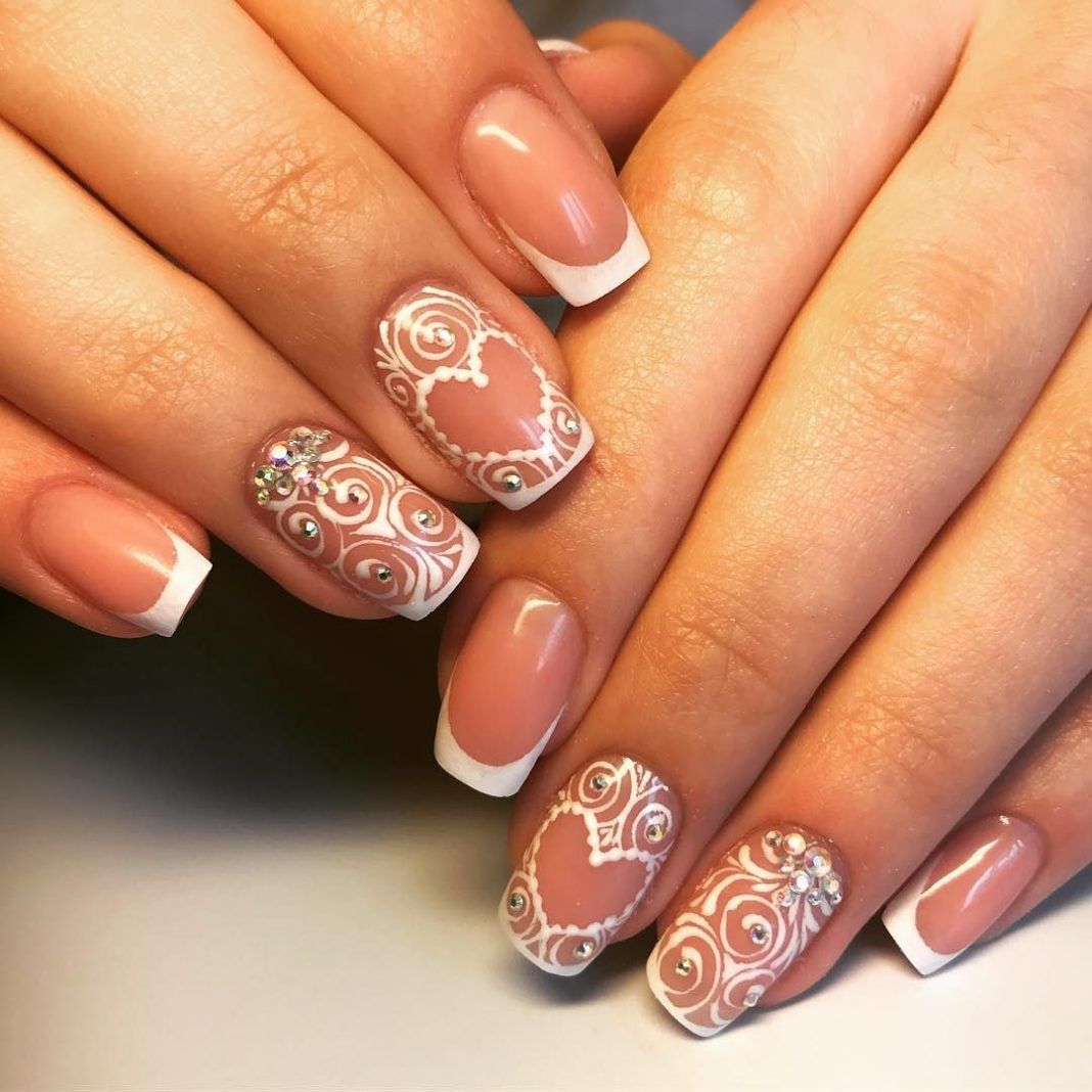 - белые кружева. Чтобы подчеркнуть чистоту и женственность, воспользуйтесь двумя базовыми цветами — белый и бежевый. Техника до неприличия проста: создайте бежевую подложку ногтя и оформите ноготь кружевной росписью;
